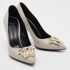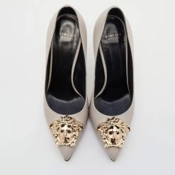 This pair of Versace pumps are a style statement with a timeless design. Crafted from grey leather, they feature pointed toes accented with the iconic Medusa motif in gold-tone metal, 9.5 cm heels and leather soles. They bring a touch of glamour to every outfit they are paired with.