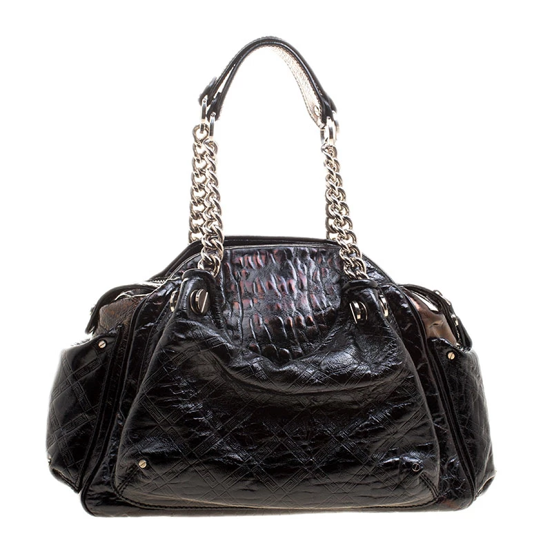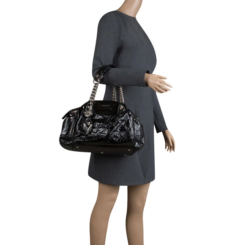 Crafted in black patent leather and accented with silver tone hardware details, this satchel from Versace is perfect for everyday and casual use to carry all your essentials with you. Featuring a quilted design on the surface and a V charm, this bag opens with a top zipper and is completed with two top chain handles for the effortless elegance.