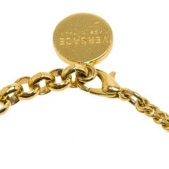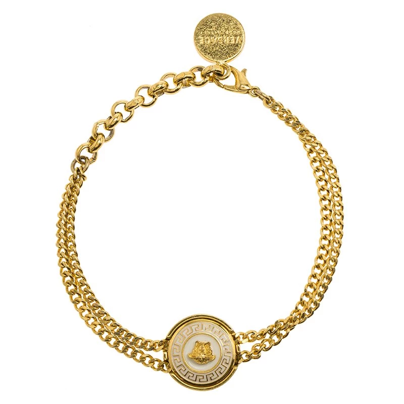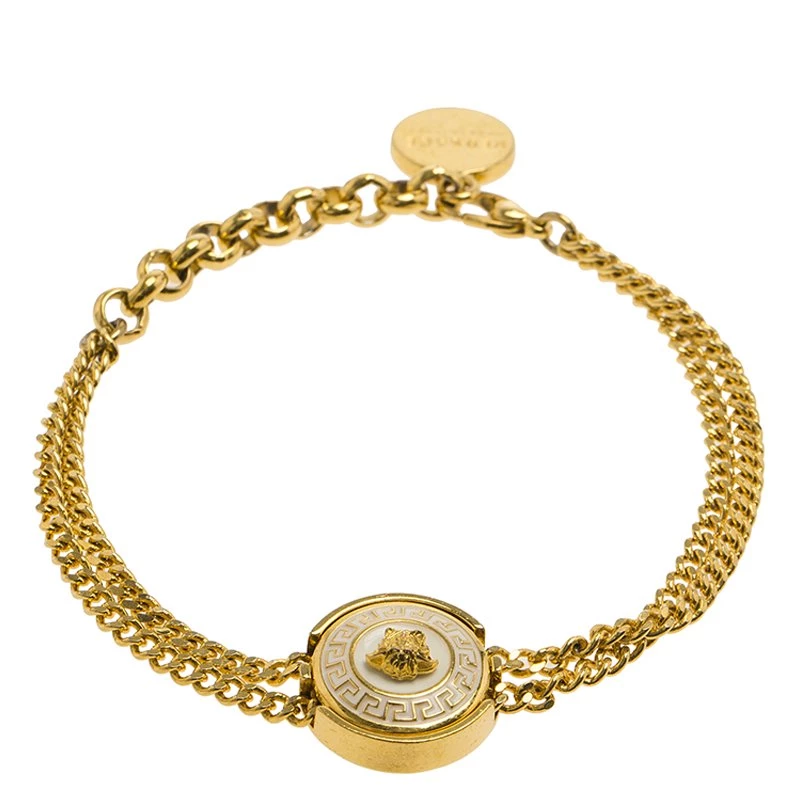 This Versace bracelet is a classic. Crafted from enamel and gold-tone metal, it features the iconic Medusa logo along with size adjustable loops. The chain linked bracelet comes with a lobster clasp closure.