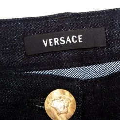 The denim panels near the waist and the zip details to the sides are the major highlights of these jeans from Versace. Crafted from a cotton blend with tapered legs and pockets, these indigo-hued jeans will look best with a casual tee and loafers.