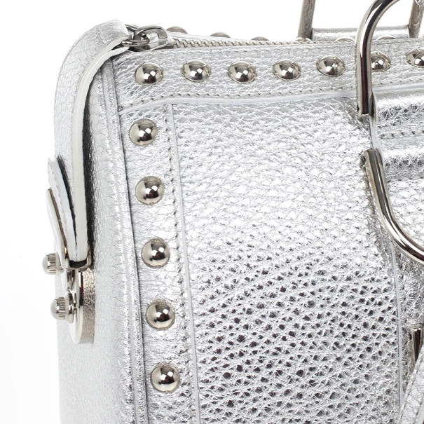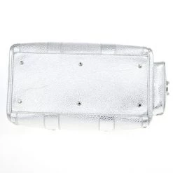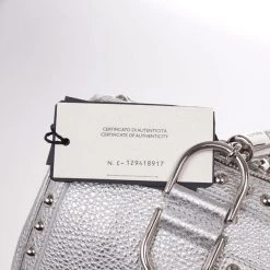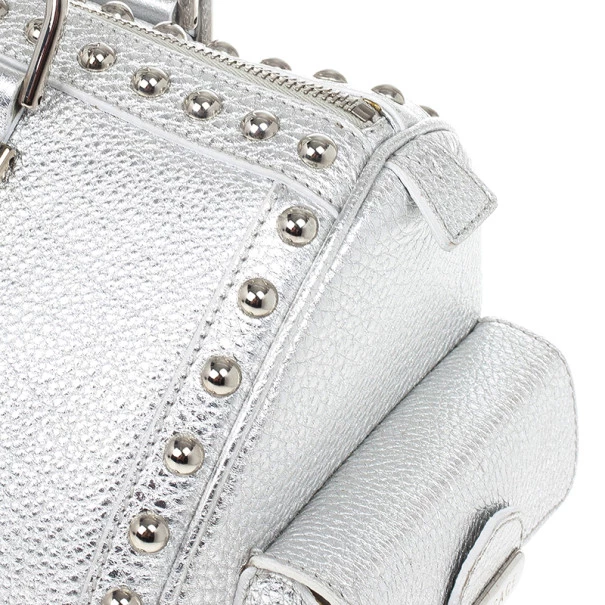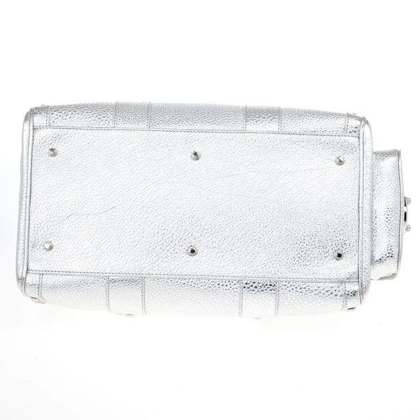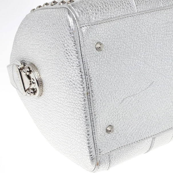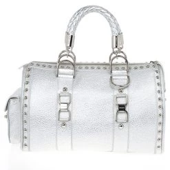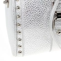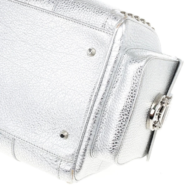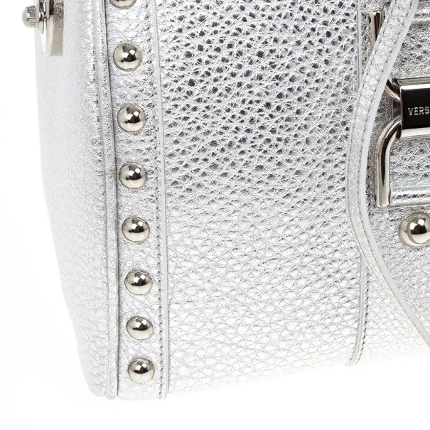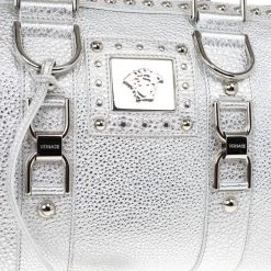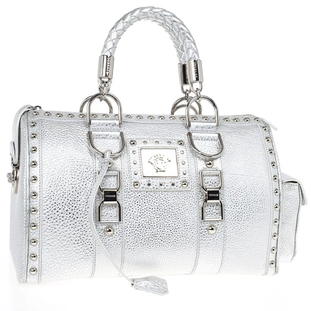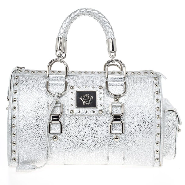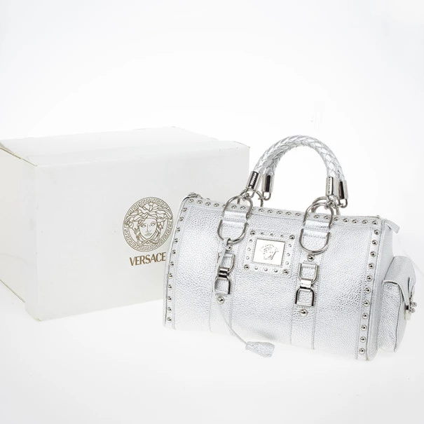 This over the top Versace Snap Out of It satchel is a bold statement making bag from the fashion forward Italian label. Crafted from silver metallic leather, it is accented with silver braided handles, a Gianni Versace Couture plate, a side pocket, silver-tone studs and hardware. The interior is lined with beige satin and features a zip pocket.Original Retail Price:US $2,075