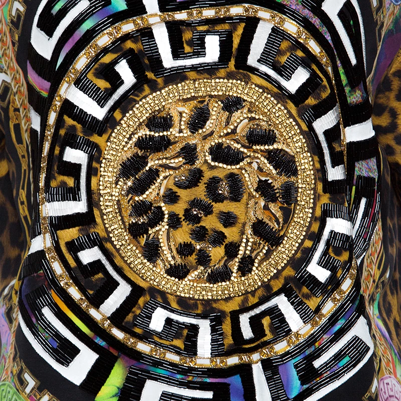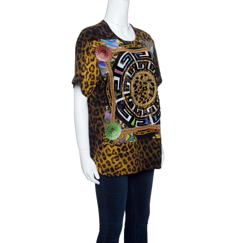 This leopard printed top from Versace will make a great companion to your statement pants and midi skirts. It is cut from silk and features short sleeves and a round neck. The top carries a beautifully embellished logo detail on the front bodice that gives it a signature finish.