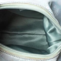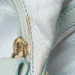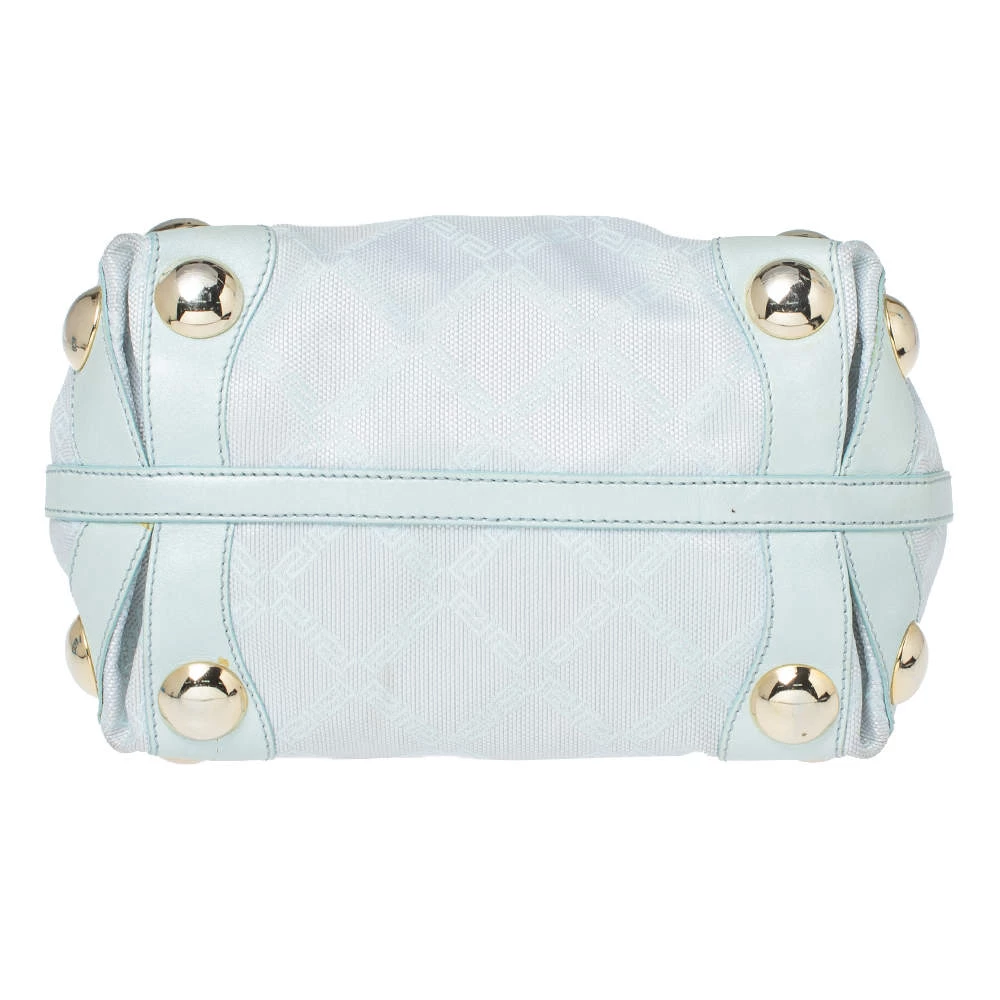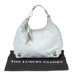 Stylish and perfect for day outings, this hobo bag by the house of Versace is a stunner. Crafted from signature canvas and leather, it comes in a lovely shade of light turquoise. It has a small silhouette, stud detailing, logo charm, single handle, fabric-lined interior and gold-tone hardware.