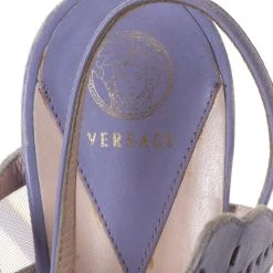 Exuding a feminine appeal, these Versace sandals are crafted in lilac leather and mesh in a beautiful silhouette. The pair is elevated with lucite platforms and towering stiletto heels. The slingback straps and leather lining ensures you walk with utmost comfort. Flaunt the pair with your A-line midi skirts and pantsuits.