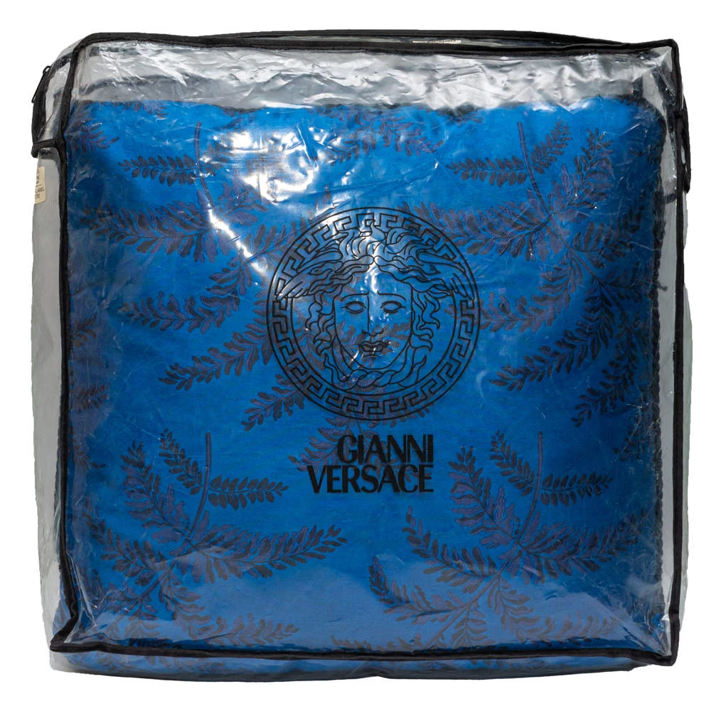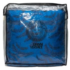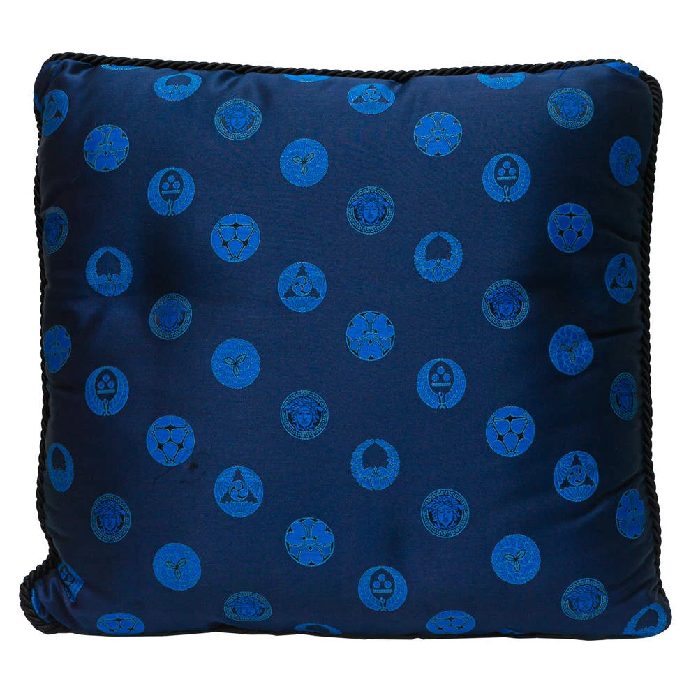 A soft, well-made cushion by Versace to add a luxe element to your home. The cushion in blue has a square shape and a spread of motifs all over.