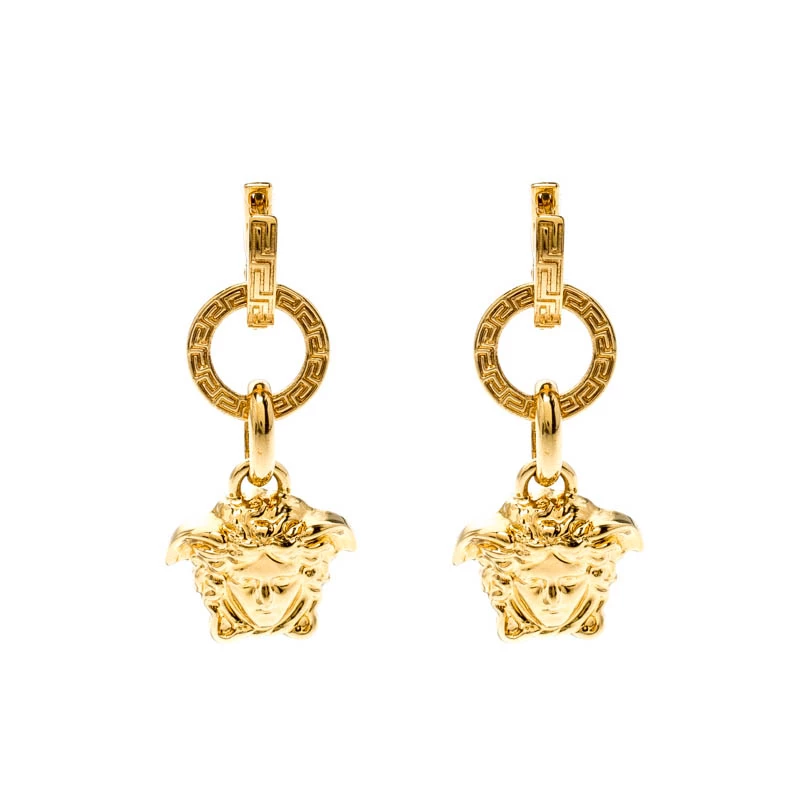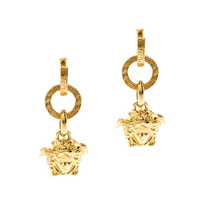 These Versace earrings are visually stunning and finely created to delight. Meticulously crafted from gold-tone metal, the pair brings dangling Medusa motifs and hoop back closures. These pretty earrings are just the perfect accessory to add a luxe touch to your casual look.