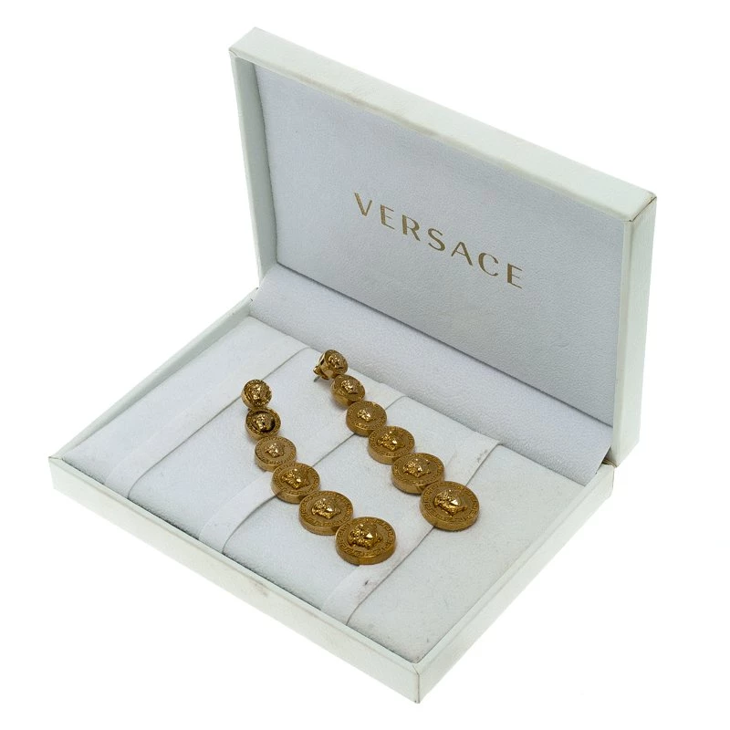 Earrings are a perfect accessory to complete an outfit. Made in Italy, these Versace earrings are feminine and modish. Crafted in gold-tone metal, the pair carries the famous Medusa engravings arranged in a stacked array. These pretty earrings are just the perfect accessory to add an elegant yet contemporary touch to your look.
