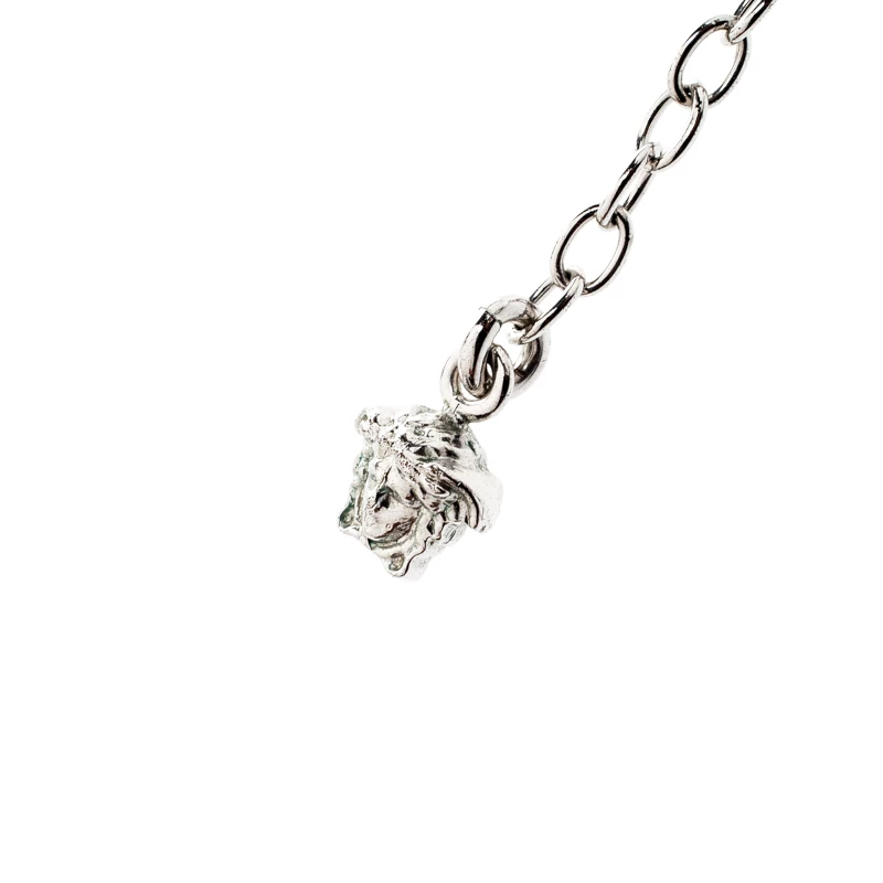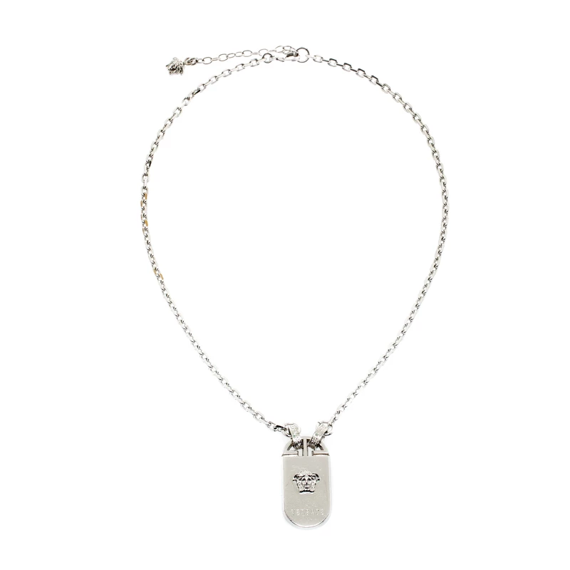 Versace’s use of the Medusa is seen not only in clothes and shoes but also in the brand’s line of accessories. Carrying the very signature is this necklace sculpted from silver-tone metal. The chain holds a tag with the brand name and the Medusa detail.