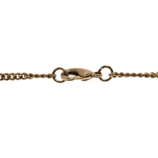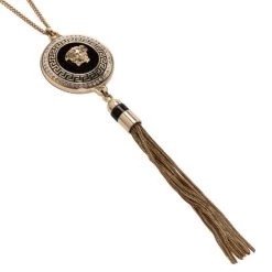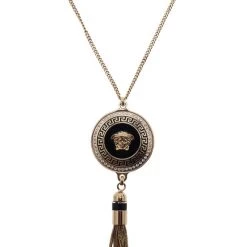 Make a statement with this Versace necklace by adding a touch of opulence to your outfit. Made from gold-tone metal, the necklace carries a round pendant embellished with shimmering crystals surrounding the Versace meander, a black enamel center, and a Medusa. It features long tassels dangling from the pendant, giving it a stylish look. Wear this piece with its matching bracelet for a complete set.