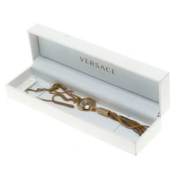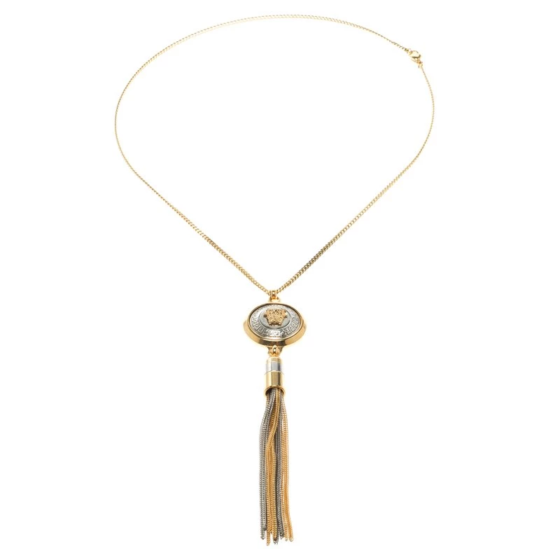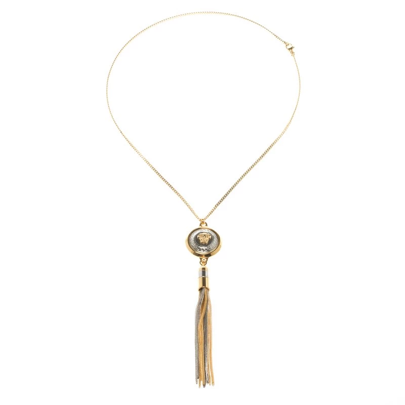 We can’t stop admiring this beauty from Versace! Beautifully crafted from a mix of gold-tone and silver tone metal, this necklace is a stunner. It has a pendant that carries the signature Medusa emblem and it is further styled with dangling chain tassels. the penadnt is held by a chain with a lobster clasp.