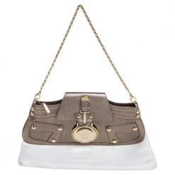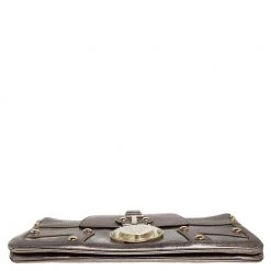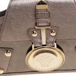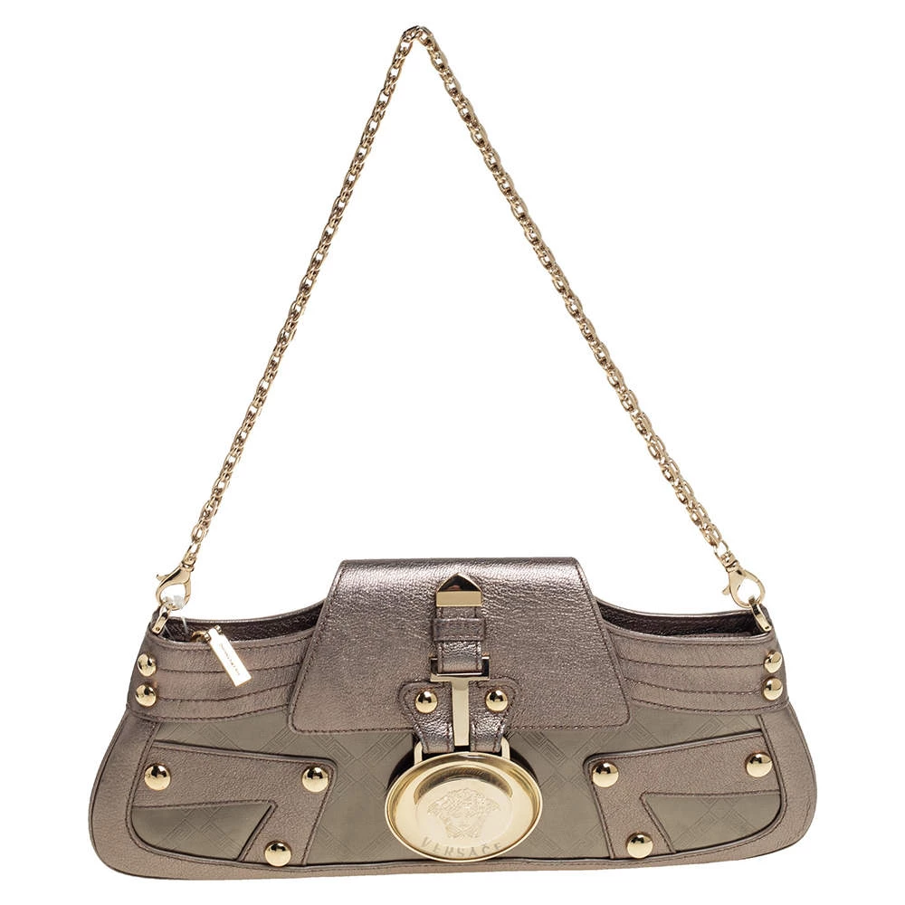 Pick this covetable Versace clutch and make a valuable addition to your closet. The label’s Medusa logo in gold-tone hardware sitting on the metallic exterior is the winning feature of this clutch. Made from embossed leather, it is equipped with a flap and a chain shoulder strap.