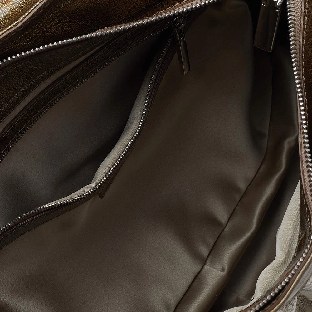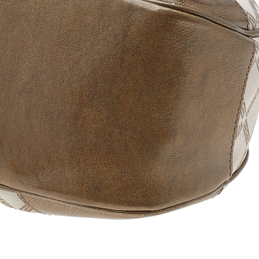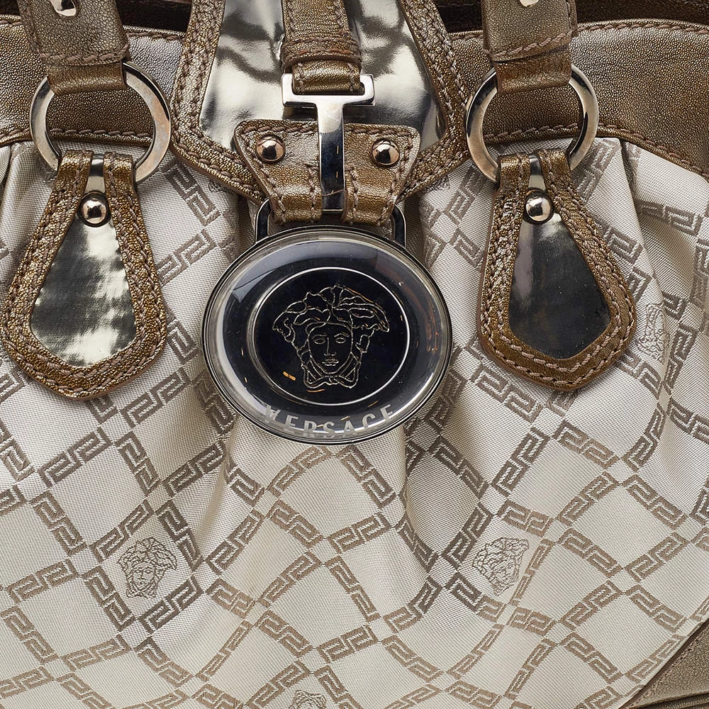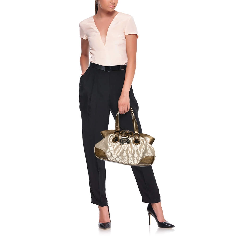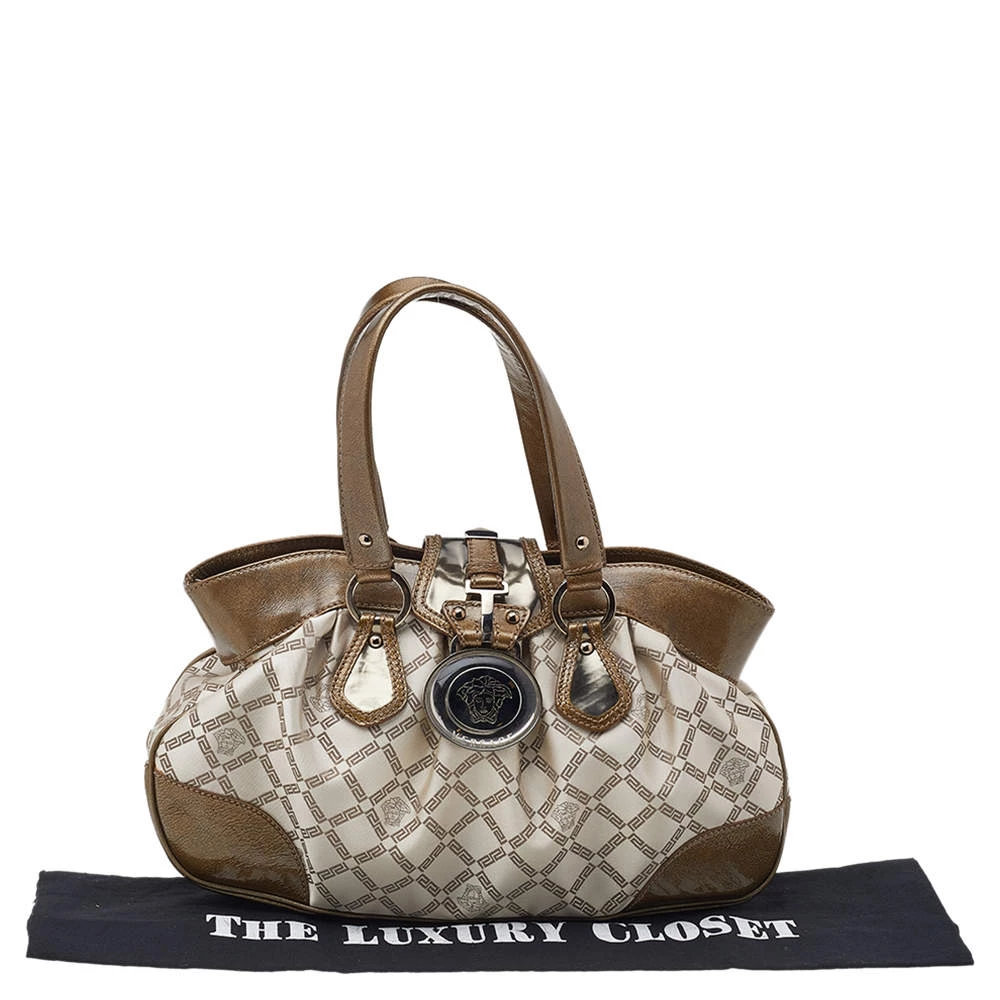 The Madonna bag from Versace is made from canvas and metallic leather. It comes with two handles, gold-tone hardware, and a logo charm on the front. It is lined with satin on the inside and will easily hold your necessities.