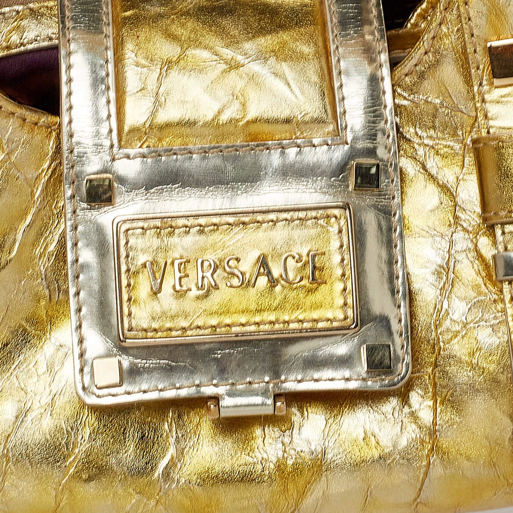 This Versace crinkled leather satchel has an alluring design. Beautifully crafted, the bag comes with a highly durable exterior, a spacious satin interior, two handles, and gold-tone hardware. The creation is ideal for daily use.