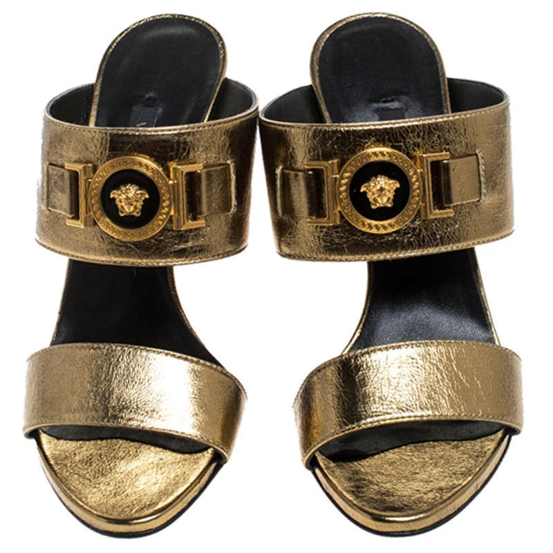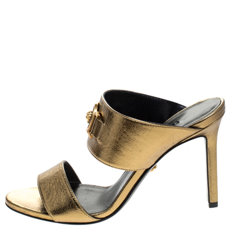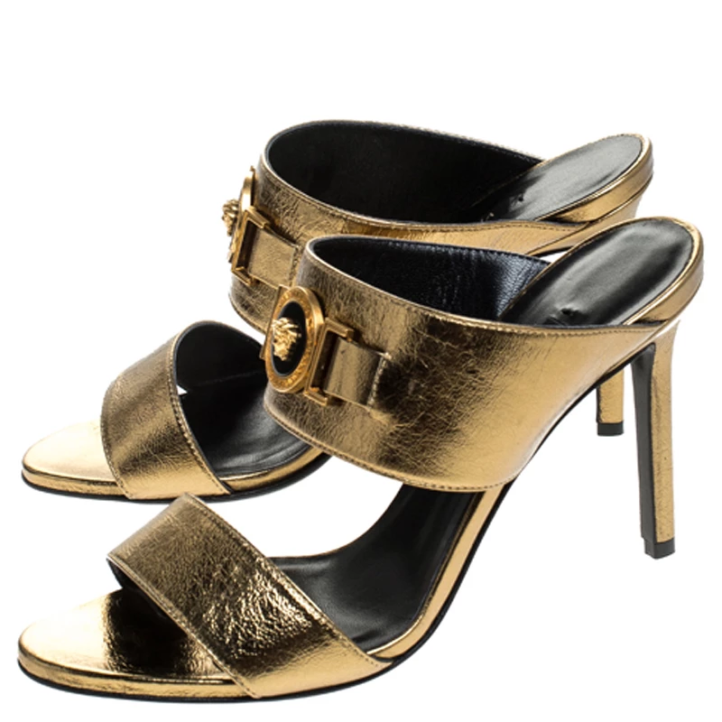 Wear these stylish sandals from the house of Versace and channel your inner fashionista. These beautiful foil leather sandals are enhanced with the signature Medusa logo at the ankle strap. This pair is complete with high heels and a leather sole. Smart and chic, break the monotony of your ensemble with these gold sandals.