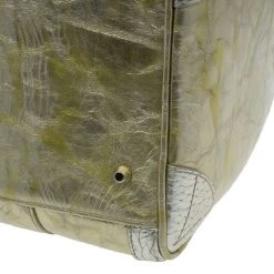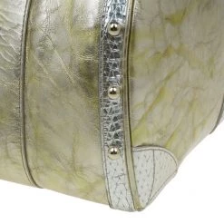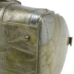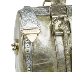 Unleash the diva in you and grab this Versace gold metallic Snap Out Of It boston bag! It is so edgy and chic, and will definitely turn heads everywhere. It features gold-tone metallic pebble-grained leather, matching gold-tone hardware and rolled leather top handles. It also features metal studs lining the bag and a side pocket.