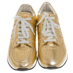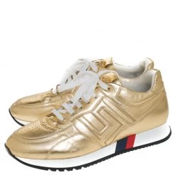 Make these stylish leather sneakers yours this season. The trendy and chic sneakers from Versace will lift up your style in an effortless way. They come in metallic gold, featuring lace-up vamps and durable rubber soles.