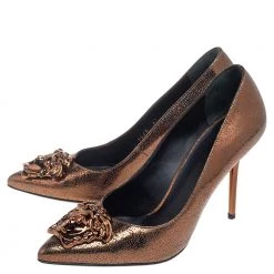 This pair of Versace pumps are a style statement with a timeless design. Crafted from gold textured-leather, they feature pointed toes accented with the iconic Medusa motif in gold-tone metal, 10 cm heels and leather soles. They bring a touch of glamour to every outfit they are paired with.