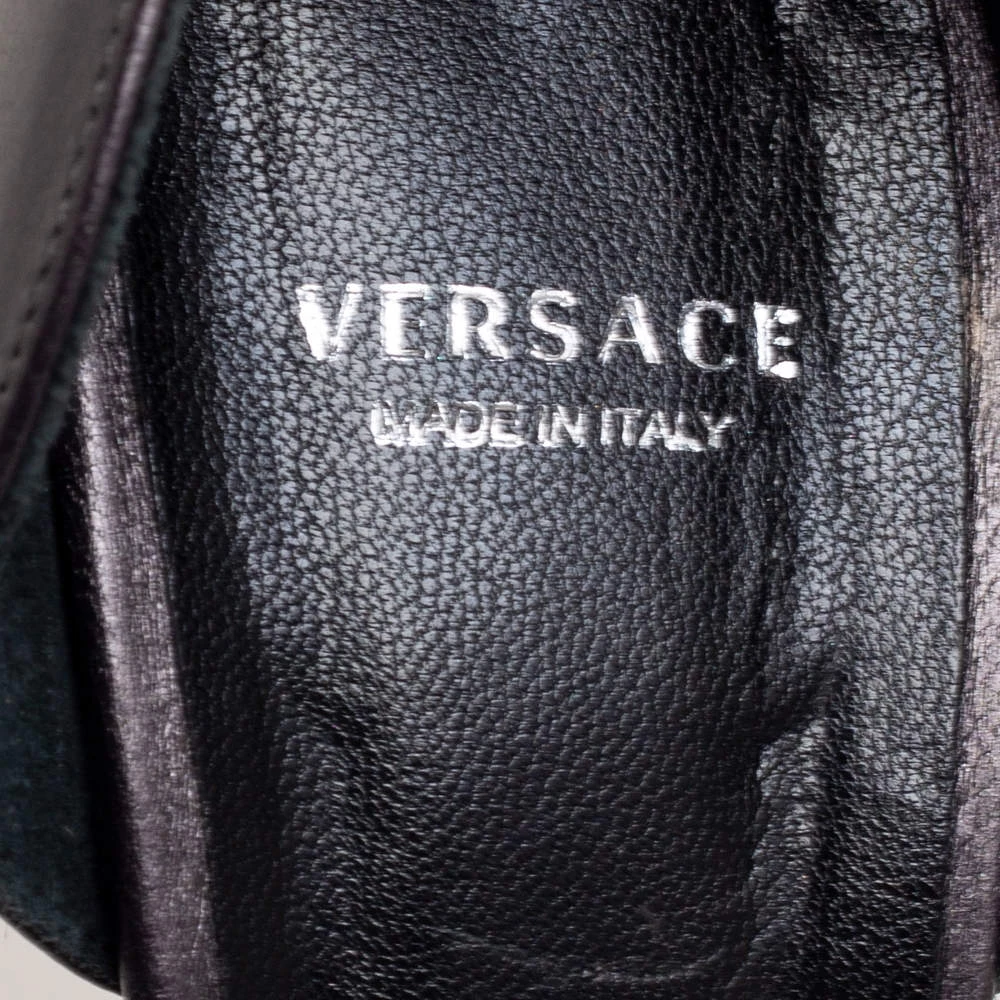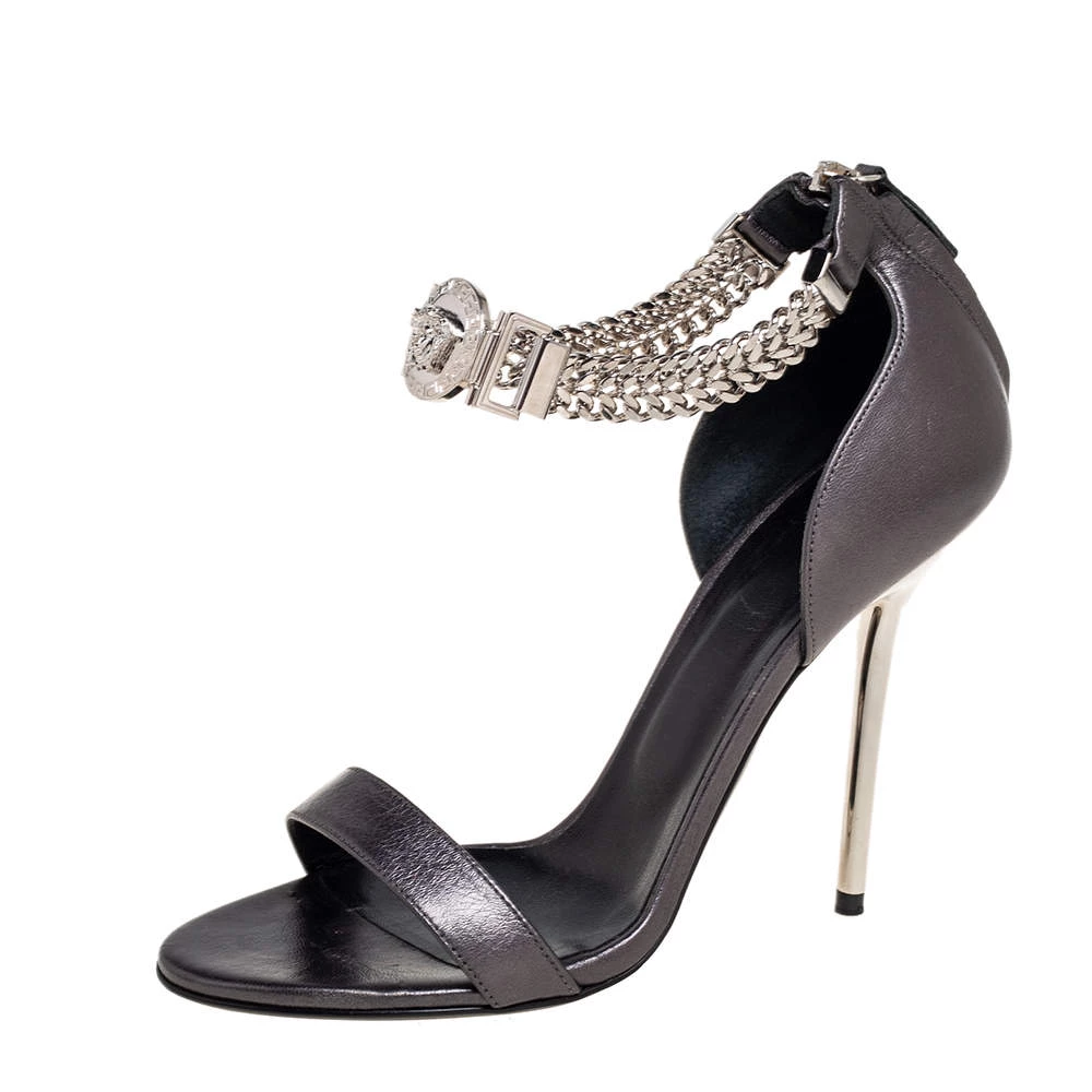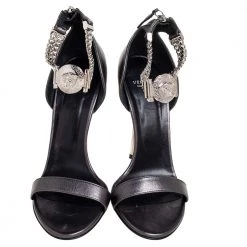 Inspired by the historical and signatory motifs of the House, these sandals from Versace accurately justify the label’s skilled flair and vintage aesthetic. They are crafted from leather and augmented with silver-toned Medusa motifs and chain details on the upper. They are completed with 11.5 cm heels.