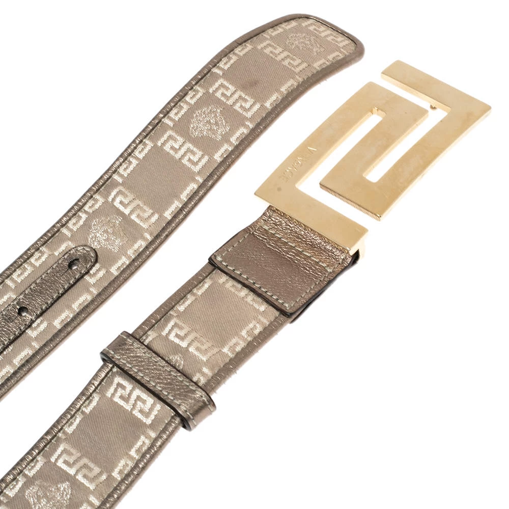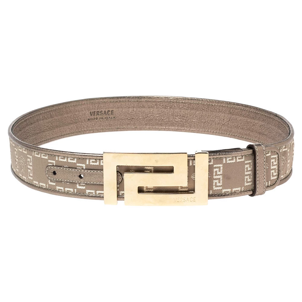 Accessorizing can effortlessly elevate an outfit and what better creation than a belt to make it happen! We have here, a Versace belt made from signature fabric and trimmed with leather. It has been adorned in a metallic grey shade and features a gold-tone Greca buckle on the front.