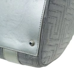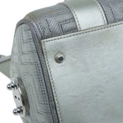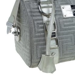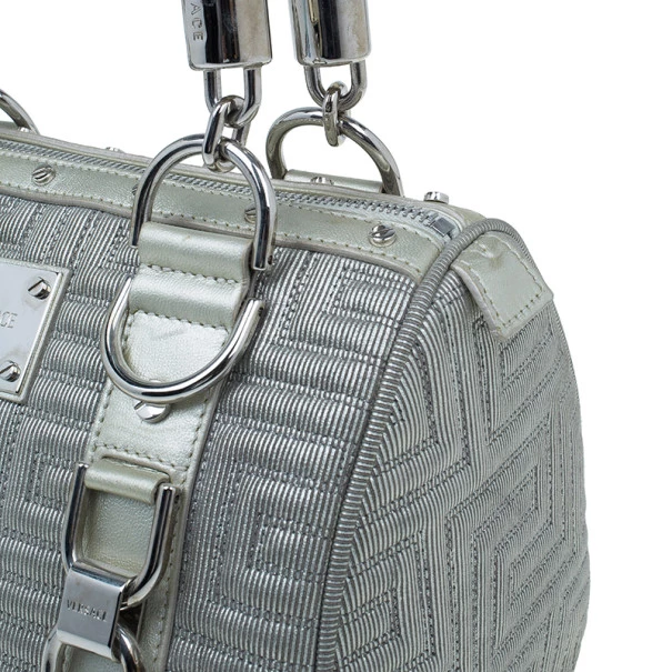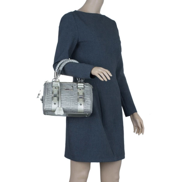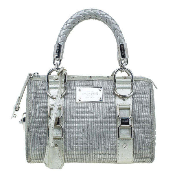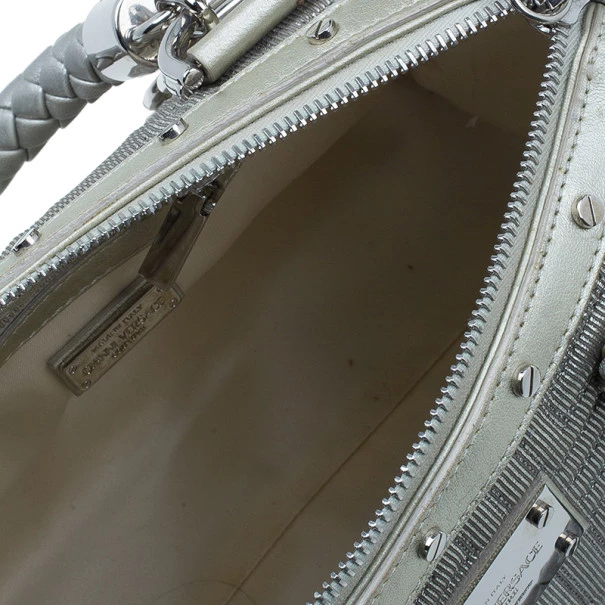 This over the top Versace Snap Out of It bag was meant to make a bold statement from the fashion forward Italian label. Crafted from light silver quilted Versace logo leather, it is accented with braided handles, a Gianni Versace Couture plate, side pocket, silver studs and hardware. The interior is lined with fabric and features a zip pocket.
