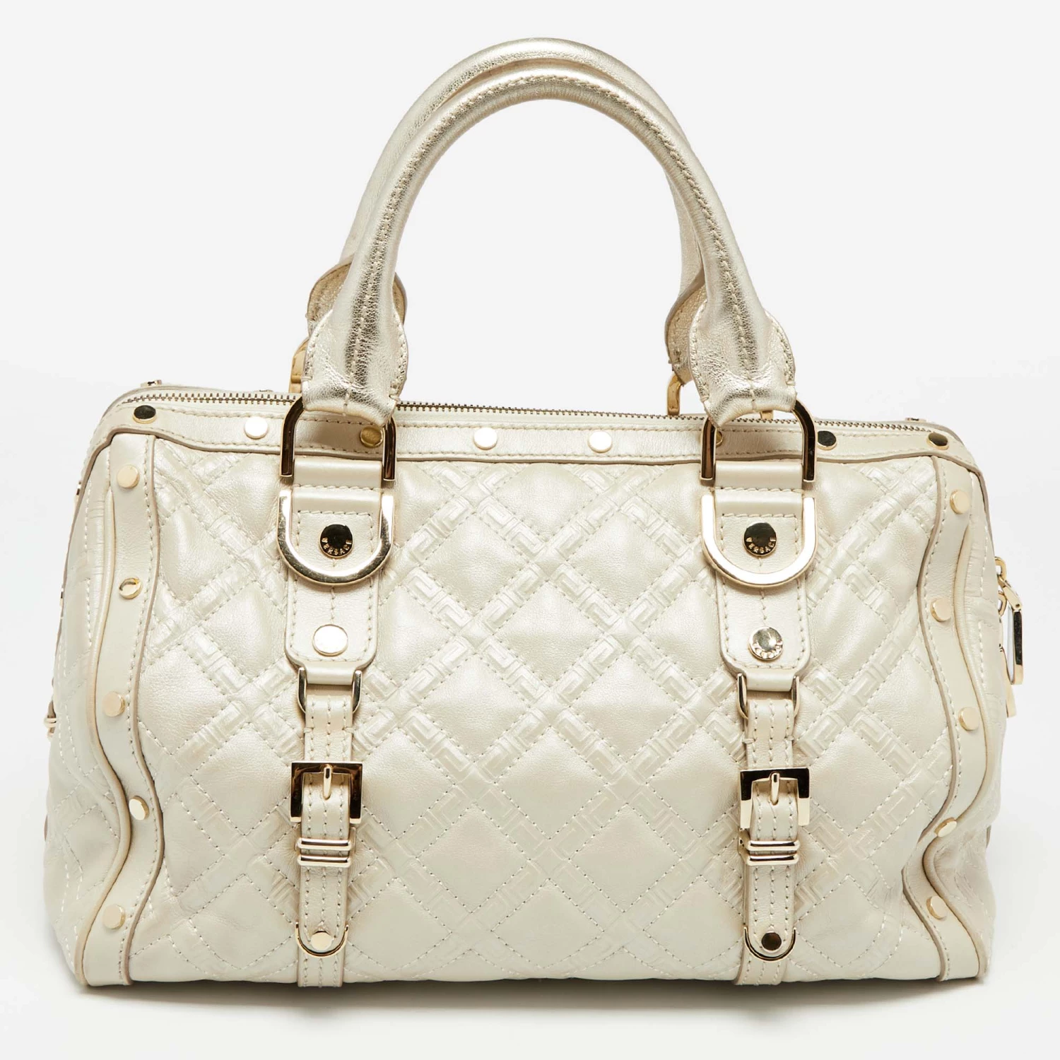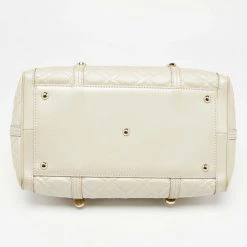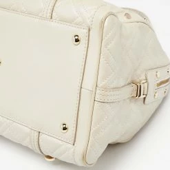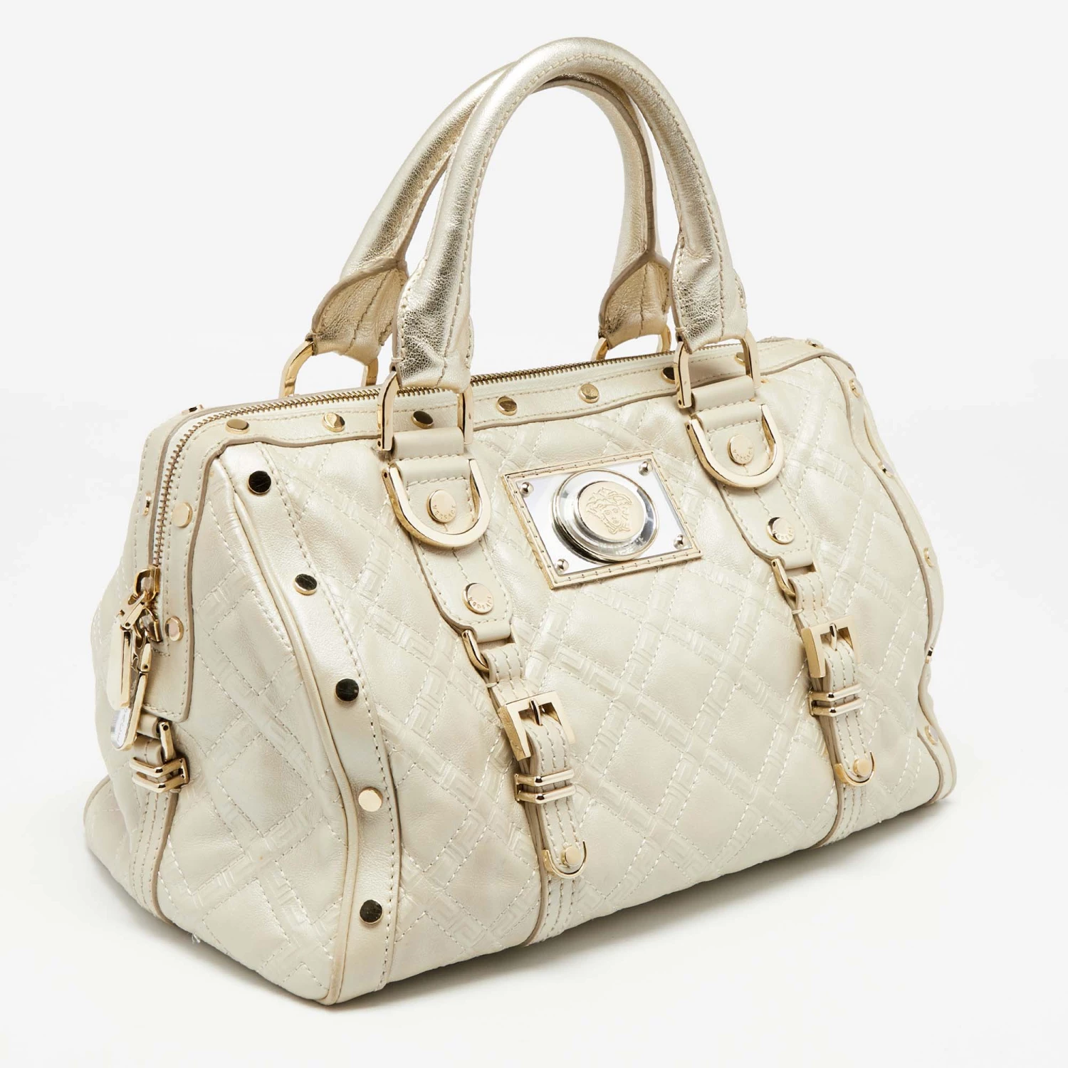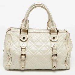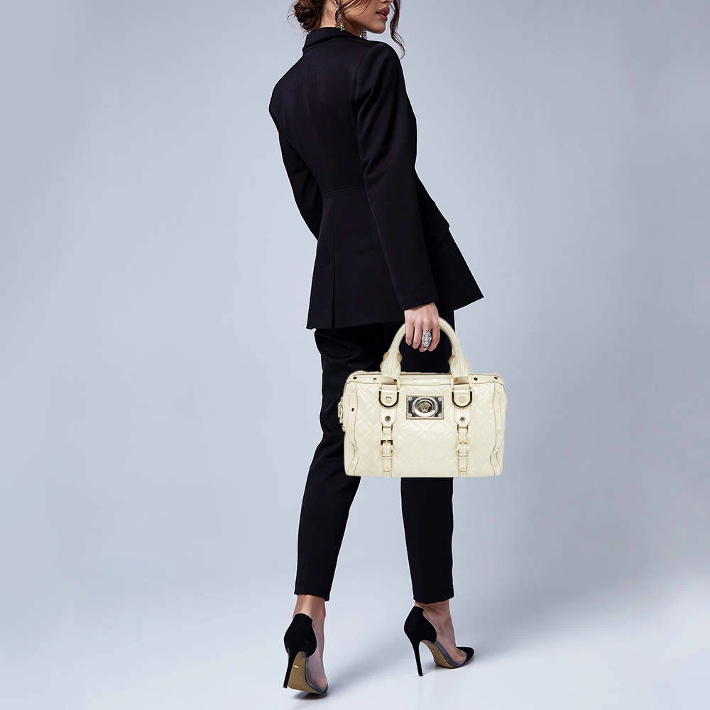 How gorgeous is this satchel from Versace! It carries an amazing design and a fabulous interplay of metallic pearl leather and gold-tone hardware. It has a zip-top leading to a satin interior while being held by two top handles. The shape and the brand logo on the front uplift its beauty and make it a buy you will not regret.