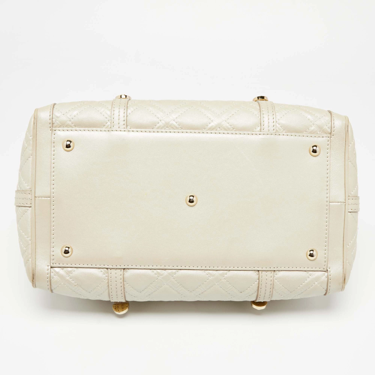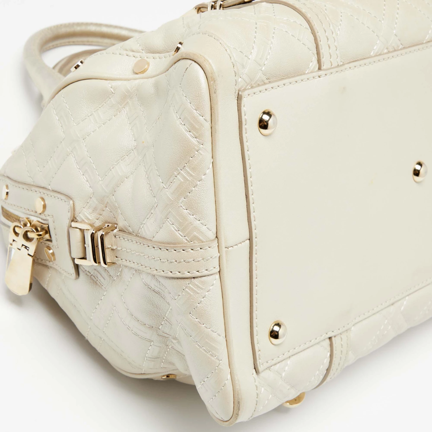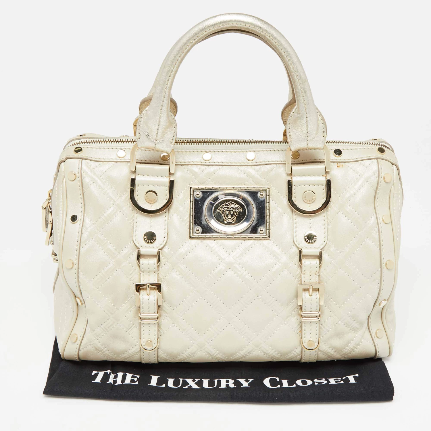How gorgeous is this satchel from Versace! It carries an amazing design and a fabulous interplay of metallic pearl leather and gold-tone hardware. It has a zip-top leading to a satin interior while being held by two top handles. The shape and the brand logo on the front uplift its beauty and make it a buy you will not regret.