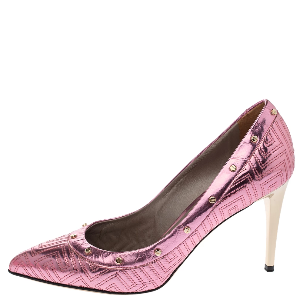 Give your collection of footwear a makeover by adding these pumps by Versace. Crafted from foil leather, they come in a lovely shade of metallic pink. They are styled with pointed toes, Greek key stitch detailing, studs along the topline and 9 cm heels.
