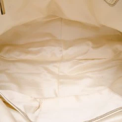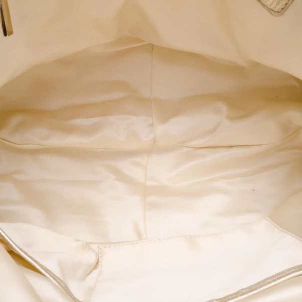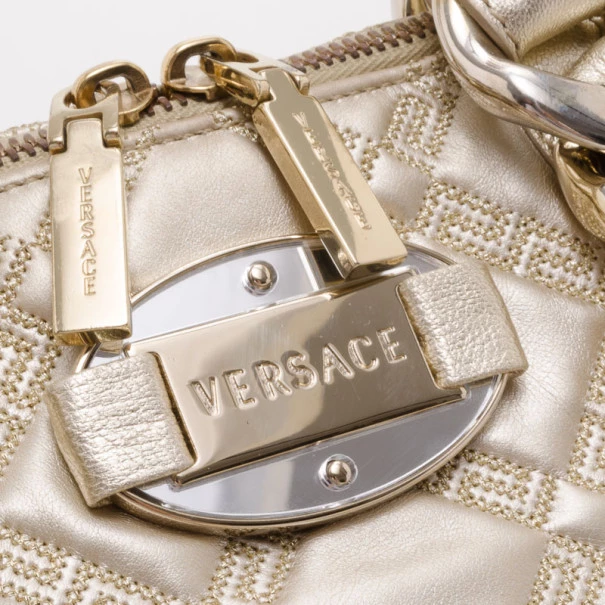 Go for a glamorous finish with this metallic quilted logo leather satchel from Italian label Versace. Crafted from metallic cream leather that is quilted with Versace logo stitching, the alluring look is finished with a Versace logo plate, chain link and leather handles, and easy to open double closures. The large interior is lined with cream fabric and features a zip pocket. Original Retail Price: US $1,695Condition: Gently Used (One very minor scuff mark on bottom corner of bag. Otherwise, very clean exterior and interior. Hardware in good condition)Dimensions: 42 CM(L) 24.5 CM(H) Handle Drop: 21 CM (Distance between handle and top of the bag)Material: Leather Exterior, Fabric InteriorHardware: Gold and Silver-toneIncludes: Original Dustbag