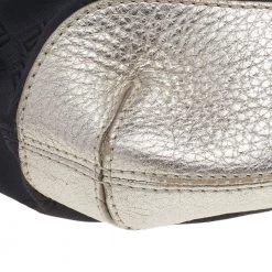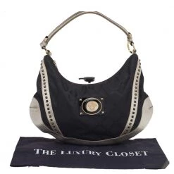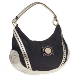 Keep it classy with a twist of edge with this Versace hobo. Its black & metallic silver signature canvas & leather exterior is designed with stud embellishments for a bold look. The top zip closure opens to a fabric-lined interior that houses enough space for essentials.