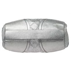 Designed in a unique and wonderful silhouette, this satchel from Versace will be a special addition for any closet. It is crafted from metallic silver leather and is accented with studs on the exterior along with a flap pocket at the front. The bag opens to a satin-lined interior housing a zip pocket. Two well-fashioned top handles and silver-tone hardware make the bag complete. Make this chic creation yours today.