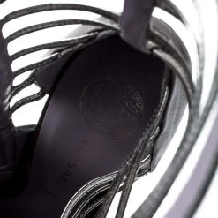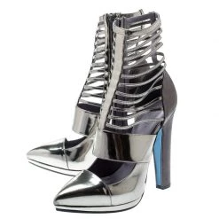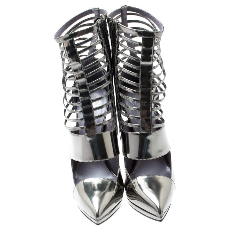 With a bold silhouette, these Versace sandals are fierce! Cage-like structure and pointed toes make these metallic silver pair an instant attention-grabber. High block heels and sturdy soles complete the luxurious look. Keep your accessories simple and let your leather shoes speak for themselves!