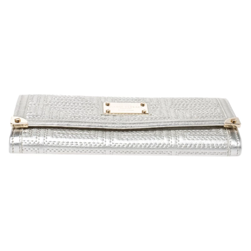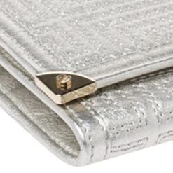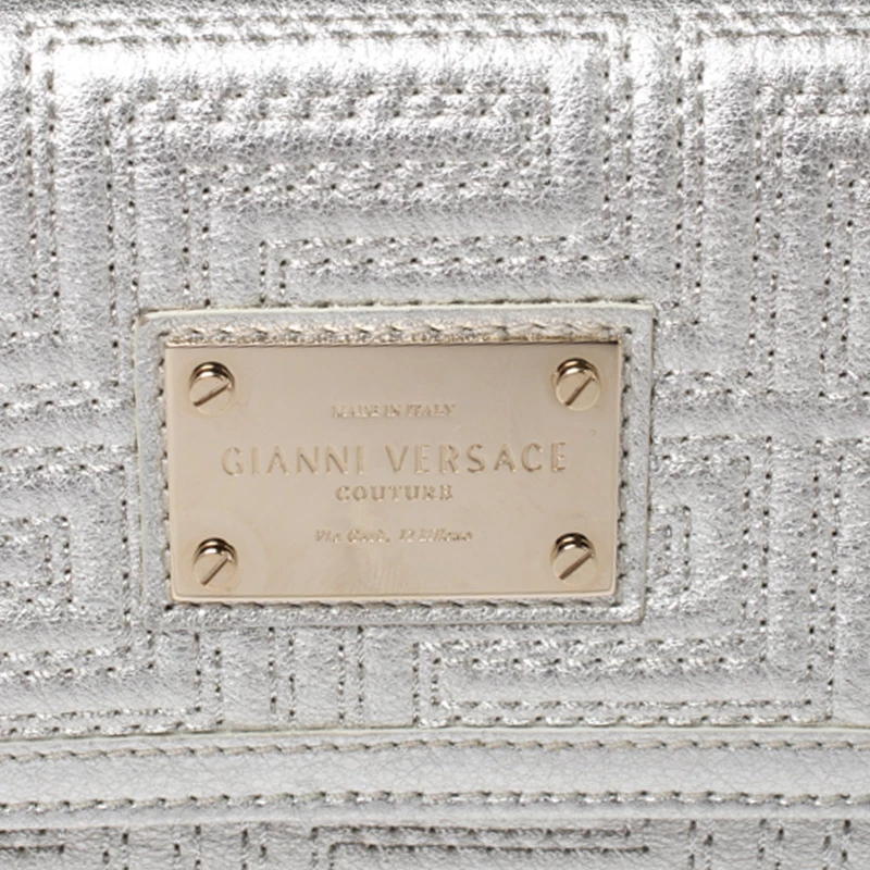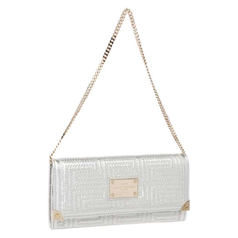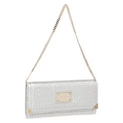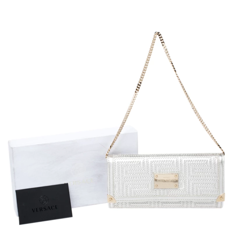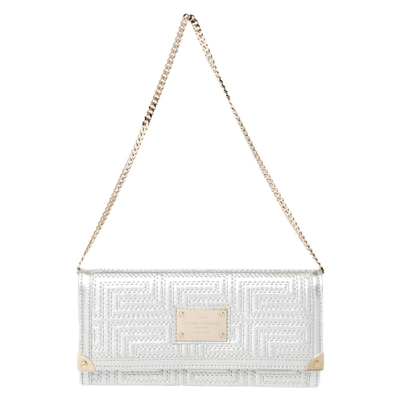 This bag from Versace will make sure you are the centre of attention wherever you go. Crafted in Italy, it is made from leather and comes in a lovely shade of metallic white. It is styled with a quilted pattern, front flap, brand plaque, satin-lined interior, zip pocket, multiple card slots, gold-tone hardware and a chain-link strap.