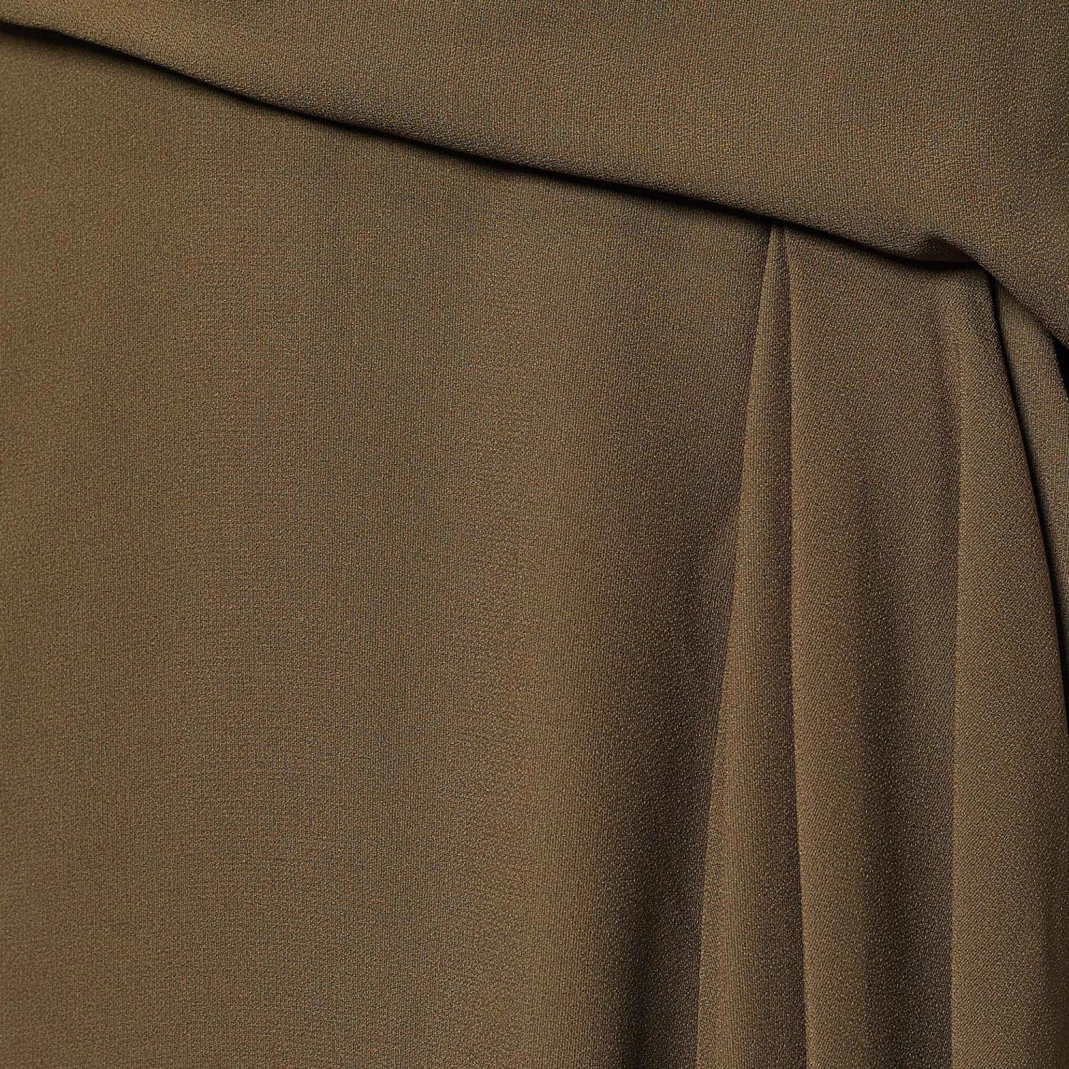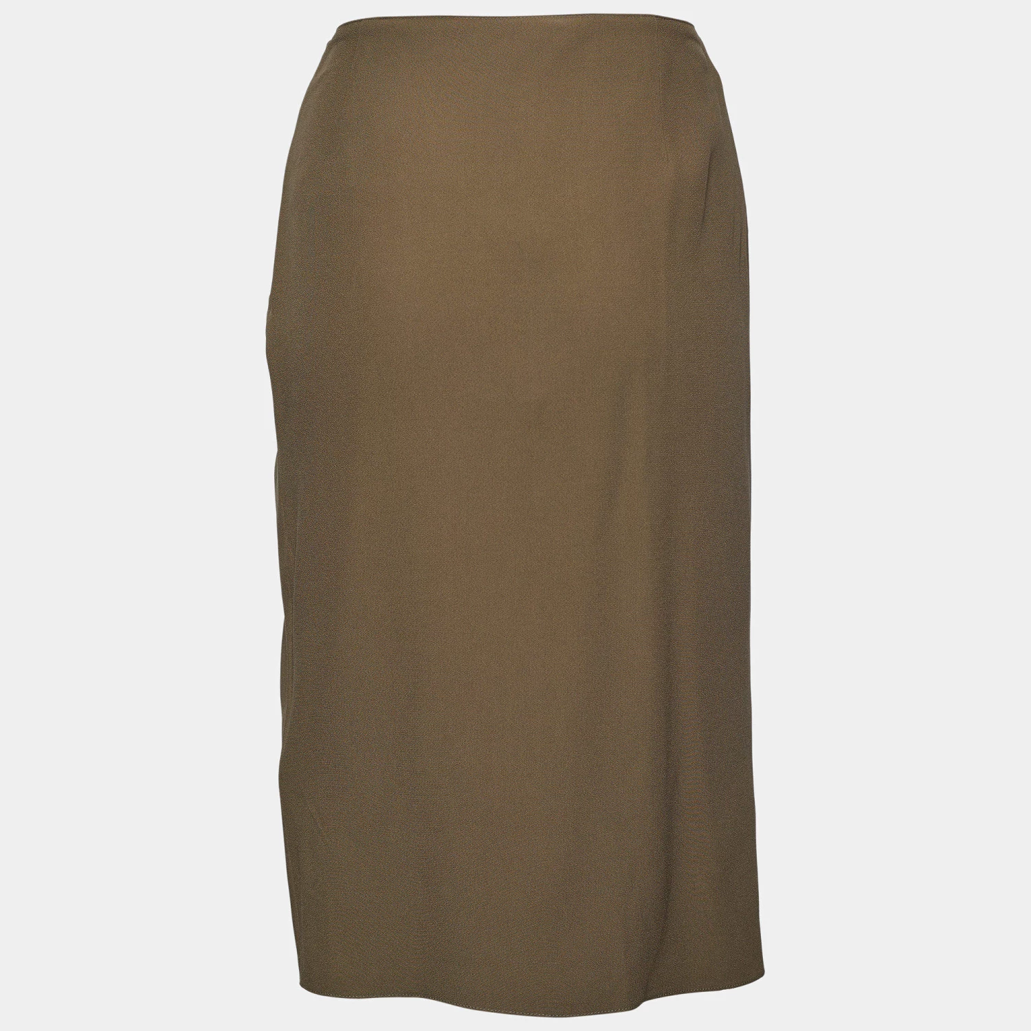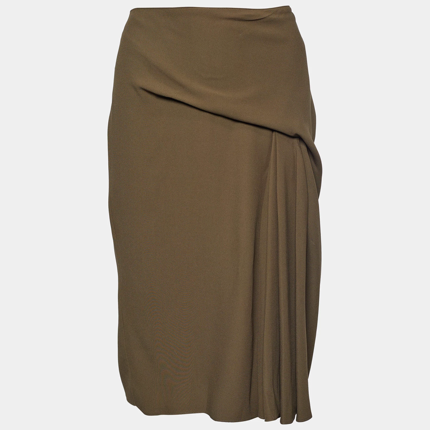 Look stylish and classy as you don this skirt from the House of Versace. It is fashioned in moss-green crepe fabric into a knee-length silhouette. It flaunts draped formations and comes with a zipper for fastening. Wear this Versace skirt with lacy blouses or shirts to achieve a chic style.
