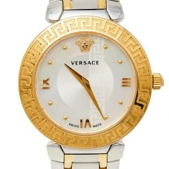 This Versace quartz wristwatch will surely be a great addition to your casual style. The case of the watch is made from stainless steel and is held by a link bracelet. It has signature engravings on the gold-plated bezel and on the mother of pearl dial, there are stud and Roman numeral hour markers and two hands.