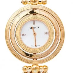 Flaunt your elegant style with this luxe wristwatch from Versace. This Eon wristwatch, created from gold-plated stainless steel, is characterized by its unique rotating case design. Following a quartz movement, the watch features a beautiful mother of pearl dial with two hands and stud hour markers. It is water-resistant up to 30 meters and is equipped with a link bracelet. (NOTE: The item may be restricted for shipping outside the UAE. Please contact us on [email protected] to check if the item can be shipped to your country.)
