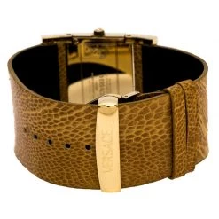 Stand out with this Versace wristwatch. Made from gold-plated stainless steel, the rectangular case holds a bevelled bezel with the meander pattern on the lugs. Its Mother of Pearl dial is contrasted with hour indexes, Roman numerals and hands. The dial also holds the Medusa insignia. Featuring a 30m water resistance level, this quartz watch has a wide leather band with engraved buckle closure. NOTE: The item may be restricted for shipping outside the UAE. Please contact us on [email protected] to check if the item can be shipped to your country.