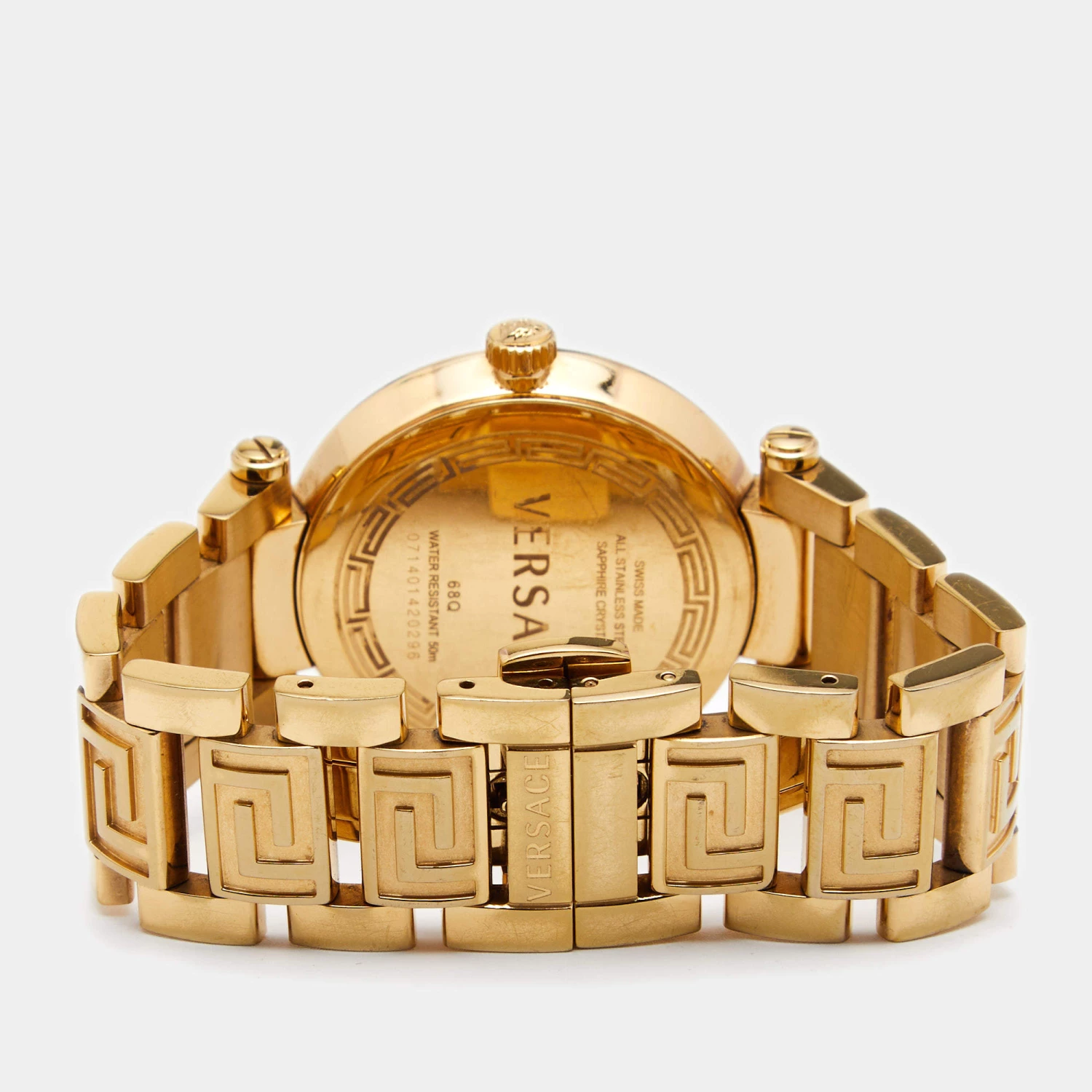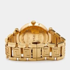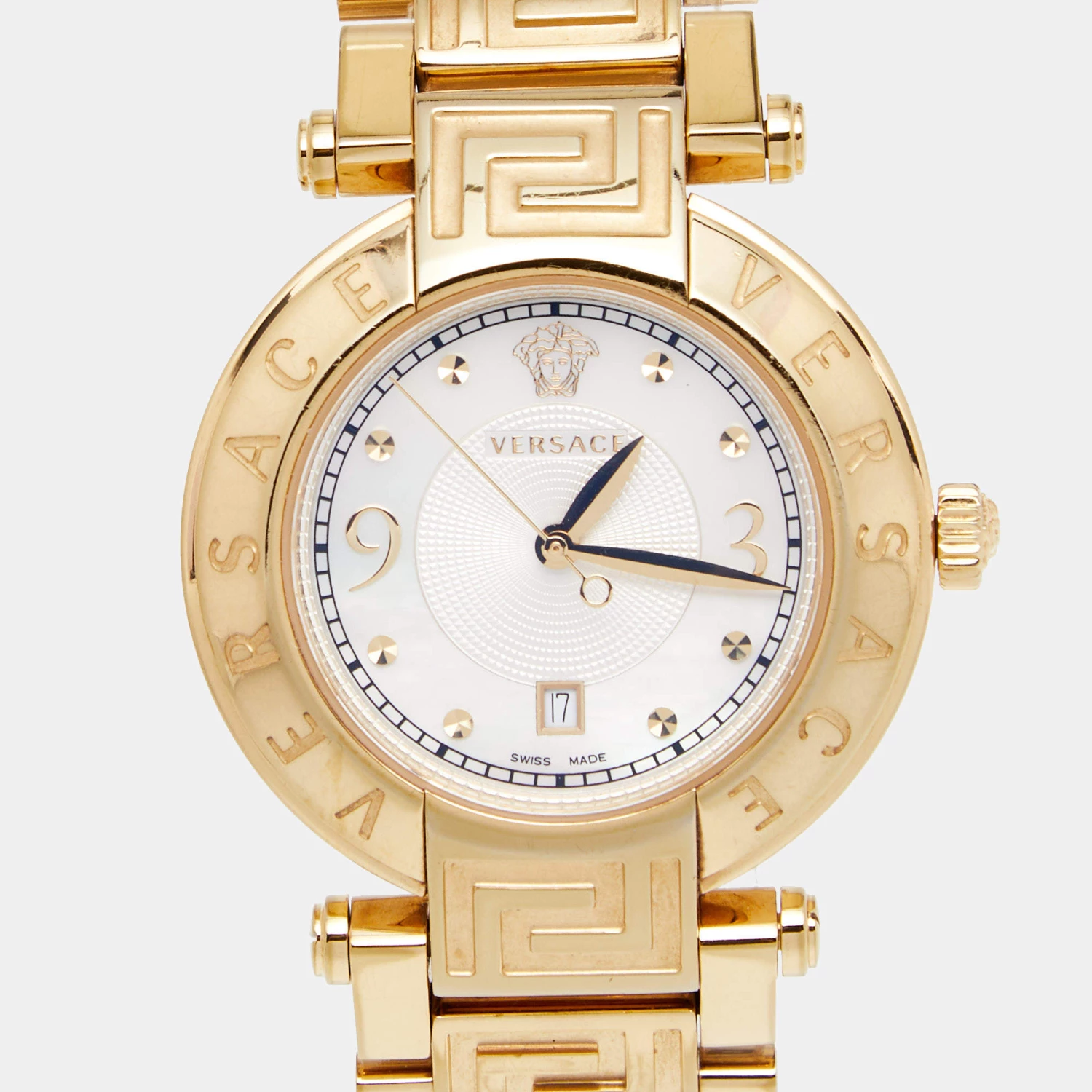 This Versace quartz watch is an ideal choice for everyday use. Made from gold-plated stainless steel, it features a branded bezel, a round case set with a Mother of Pearl dial, and a comfortable link bracelet. NOTE: The item may be restricted for shipping outside the UAE. Please contact us on [email protected] to check if the item can be shipped to your country.