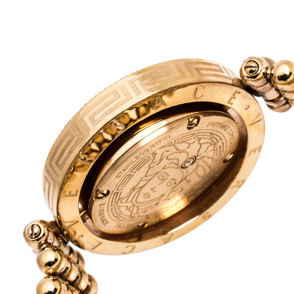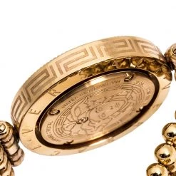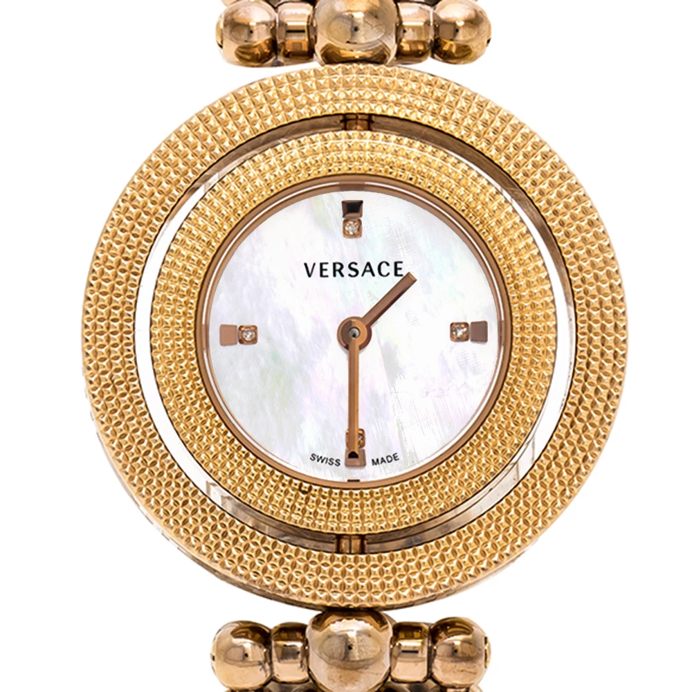 Flaunt your elegant style with this luxe wristwatch from Versace. This Eon wristwatch, created from rose gold PVD-coated stainless steel, is characterised by its unique rotating case design. Following a quartz movement, the watch features a beautiful mother of pearl dial with two hands, and quarterly hour indexes. It is complete with a matching, beaded bracelet.