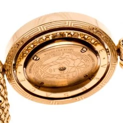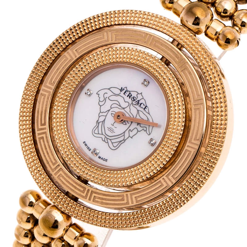 Flaunt your elegant style owning this luxe wristwatch from Versace. This Eon wristwatch, created from rose gold-plated stainless steel, is characterised by its unique spinning case design. Following a quartz movement, the watch features a beautiful, white Mother of Pearl dial with the iconic Medusa head, gold-tone hands, and stone hour markers. It is water-resistant up to 30 meters and is equipped with a beaded chain-link bracelet that fastens with a simple clasp.