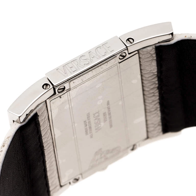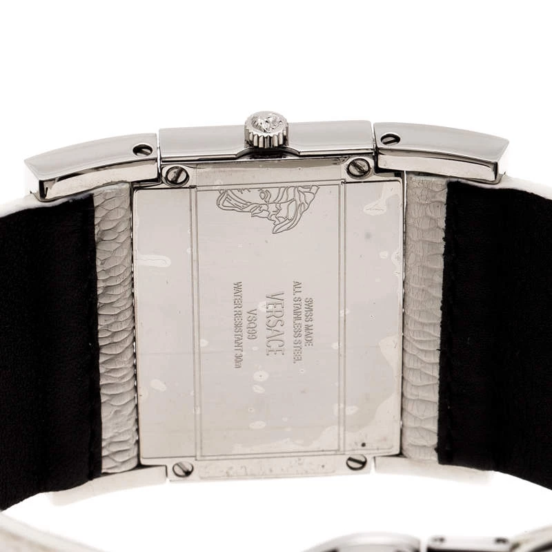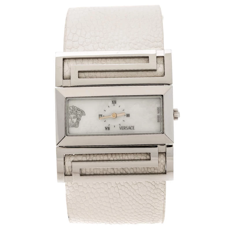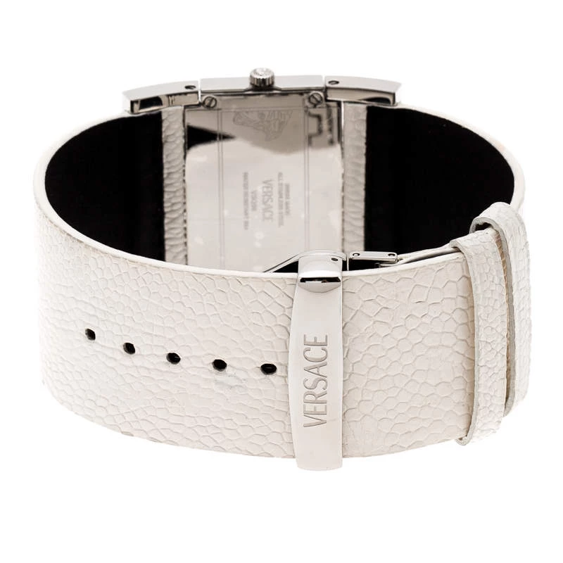 Stand out with this Versace wristwatch. Made from stainless steel, the rectangular case holds a bevelled bezel with the meander pattern on the top and bottom sides. Its mother of pearl dial is contrasted with hour indexes, Roman numerals and hands. The dial also holds the Medusa insignia. Featuring a 30m water resistance level, this quartz watch has a wide and embossed leather band with engraved buckle closure. (Note: The item may be restricted for shipping outside the UAE. Please contact us on [email protected] to check if the item can be shipped to your country.)
