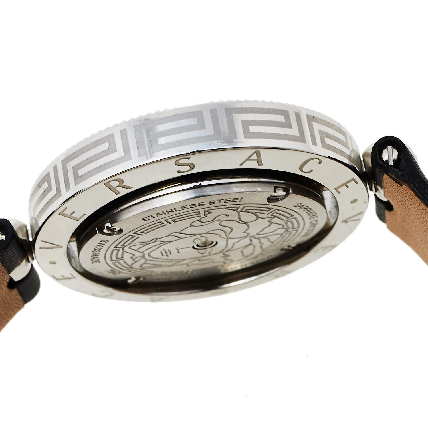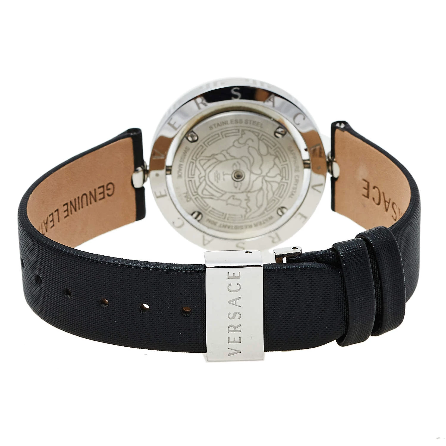 Flaunt your elegant style with this luxe wristwatch from Versace. This Eon wristwatch, created from stainless steel, is characterized by its unique rotating case design. Following a quartz movement, the watch features a beautiful mother of pearl dial with the iconic Medusa head, two hands, and studded hour markers. It is water-resistant up to 30 meters and is equipped with a leather and stainless steel bracelet that fastens with a fold-over clasp. (Note: The item may be restricted for shipping outside the UAE. Please contact us on [email protected] to check if the item can be shipped to your country.)