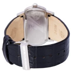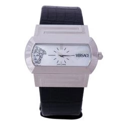 Stand out with this slick Versace wristwatch. Made from stainless steel, the horizontal oval case holds a beveled bezel engraved with the meander pattern on the top and bottom sides. Its Mother of Pearl dial is contrasted with black hour indexes and silver-tone indicators at the 6 and 12 o’clock matching with the pointed hands. Its right and left sides hold ther Versace logo and an outlined design of the Medusa insignia. Featuring a 30m water resistance level, this quartz watch has a wide and embossed leather band with an engraved buckle closure.Original Retail Price: US $884