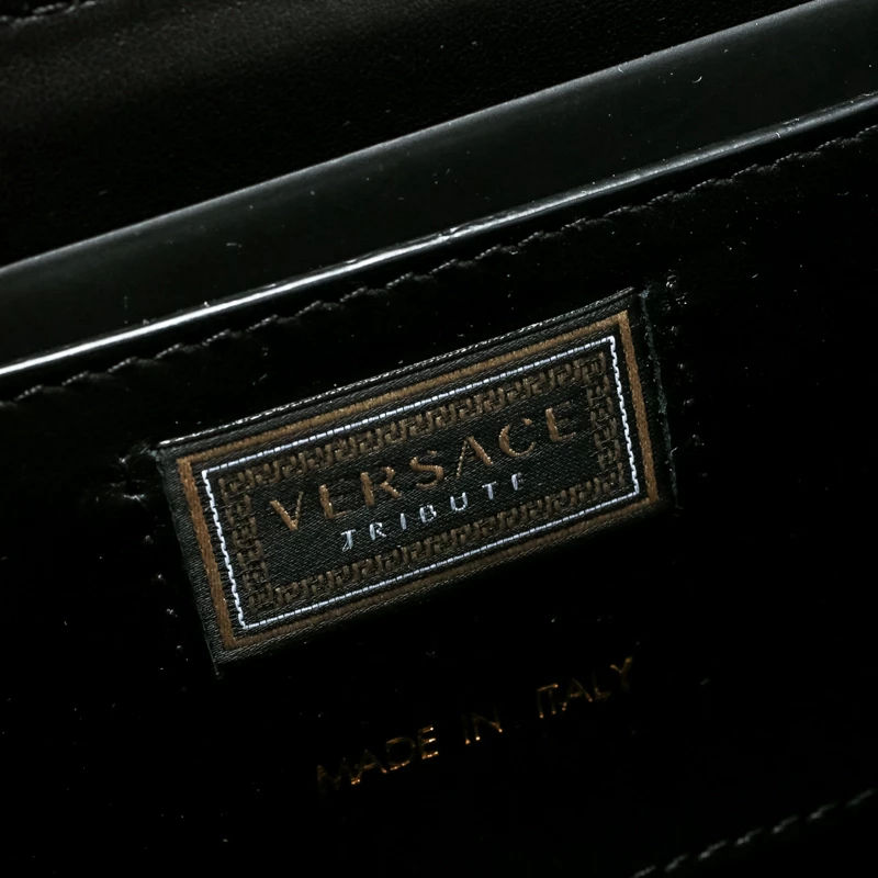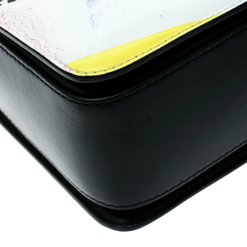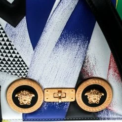 Make a striking appearance with this fashionable shoulder bag by Versace. This elegant creation is at once a fashion statement as well as a rational necessity. It is crafted from leather is adorned with multicolored prints all over along with two gold-tone signature Medusa motifs, one on each side of the turn lock closure. Lined with leather, it has a spacious interior where you can stow all your basics. This pretty piece is complete with a padlock, a key in leather clochette and a shoulder strap.