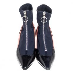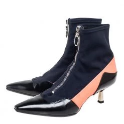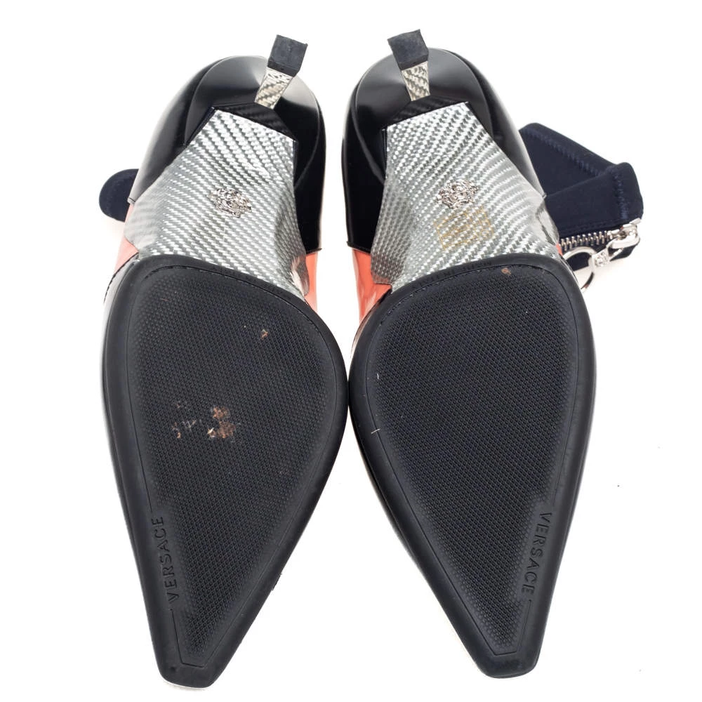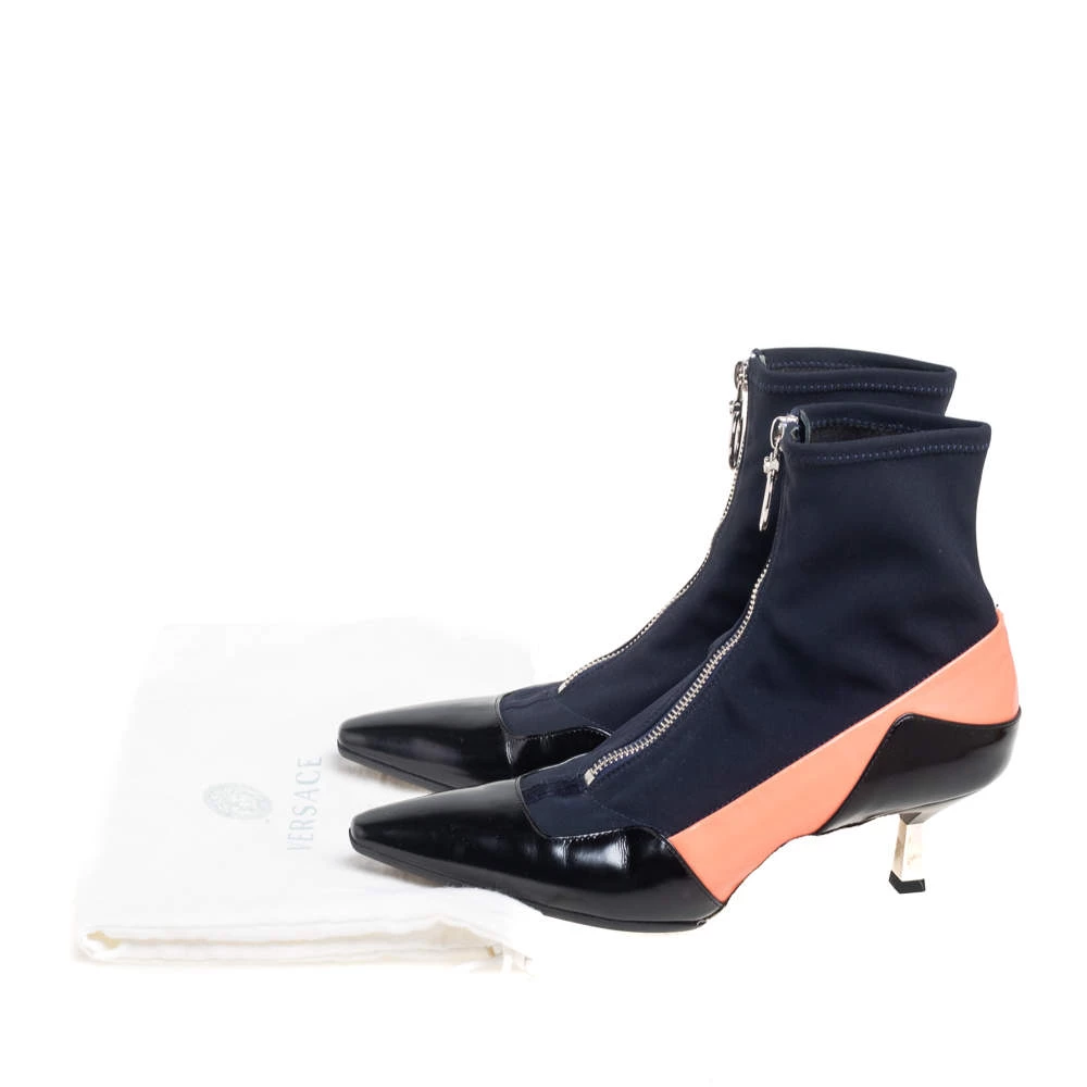 Versace designs are created with such versatility and chic aesthetics that they are bound to remain memorable to you. These boots from Versace are designed using multicolored fabric and leather into an ankle-length silhouette. They show pointed toes, a silver-toned zipper, and 6 cm heels.