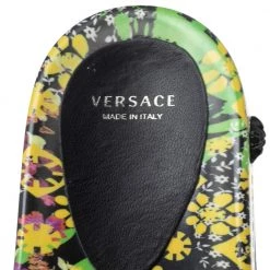 These Versace slides have a printed patent leather upper stacked upon a solid black platform base. The Medusa logo on the uppers gives the design a signature slant.