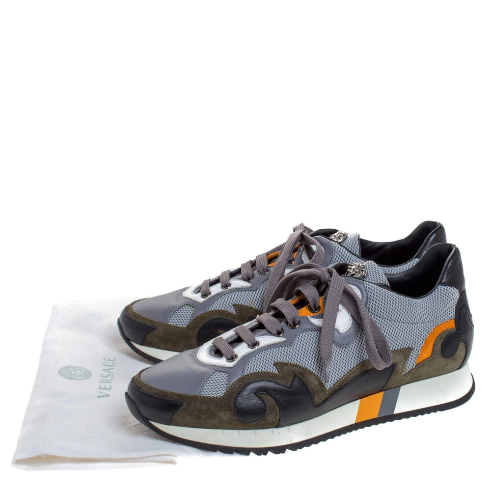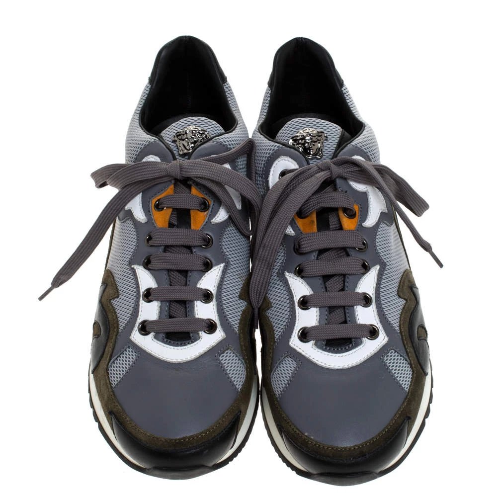 These trendy and chic sneakers from Versace will amp up your style. These mesh, leather and suede sneakers are ideal to lend a dramatic twist to your outfit. They are styled with round toes, lace-ups, signature Medusa logo on the tongues and silver-tone hardware. They are finished with rubber soles.
