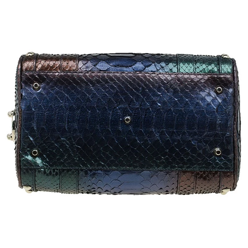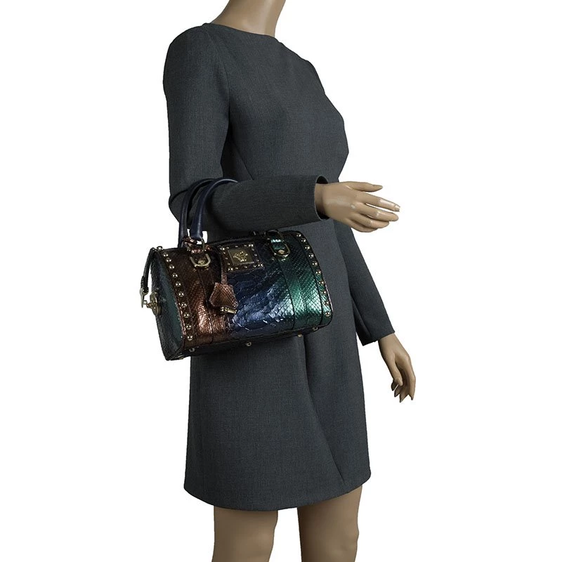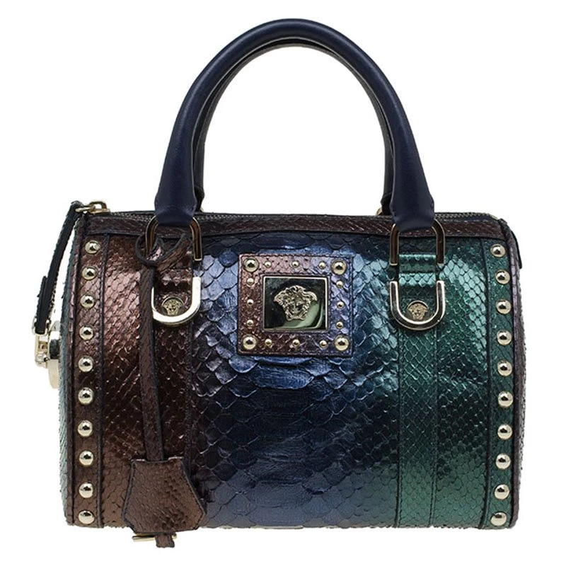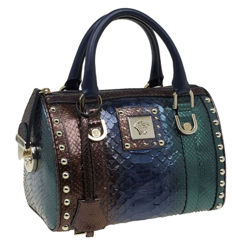 An attention-getter, Versace’s Madonna bowler bag is crafted from multicoloured python leather accented with gold-tone hardware and blue leather trim. It has two short handles making it easier to carry it in the crook of your arm.