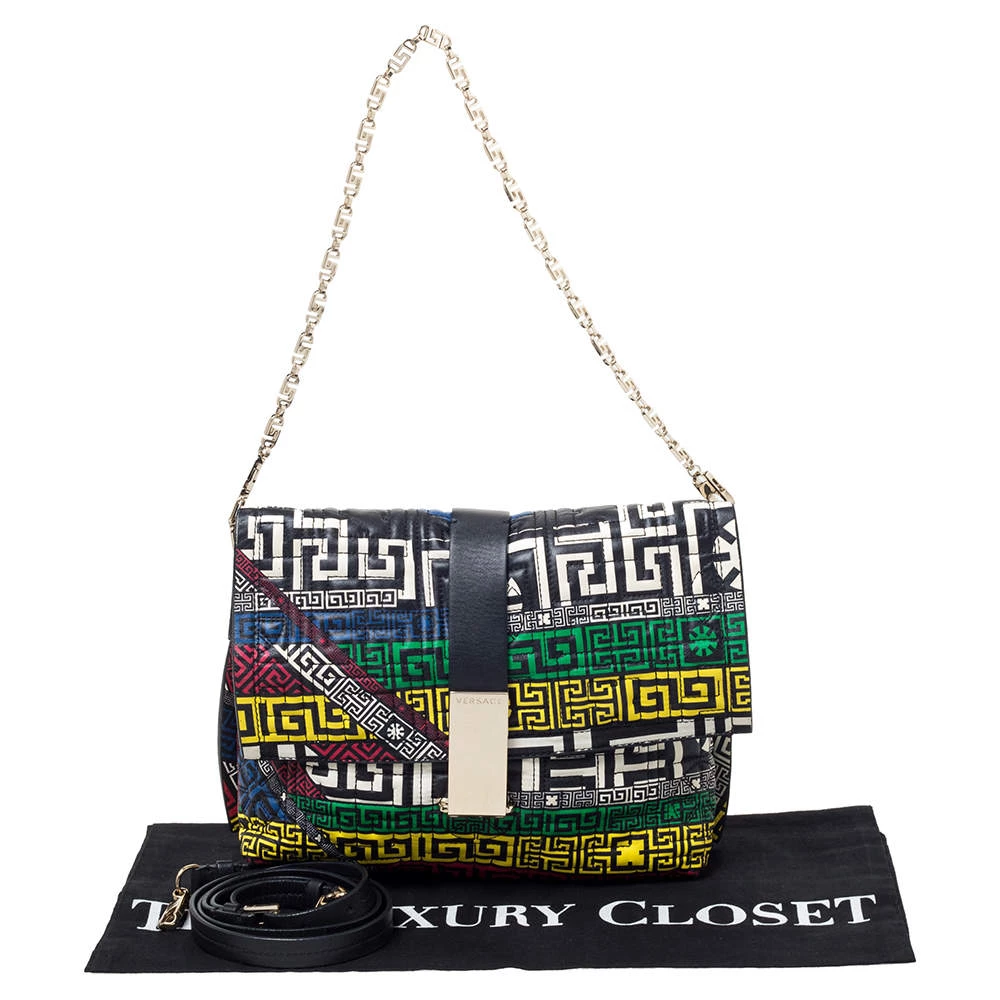 Look stylish and fancy in this Versace crossbody bag. Shaped in quilted leather, this bag is designed with a front flap and a chainlink shoulder strap. The standard leather lining on the interior ensures the durability of this bag. Be bold and be marvellous with this multicoloured bag that is ideal for you.