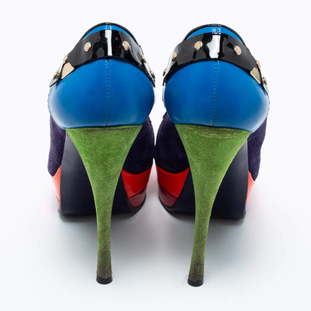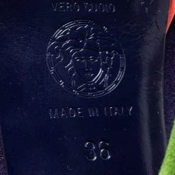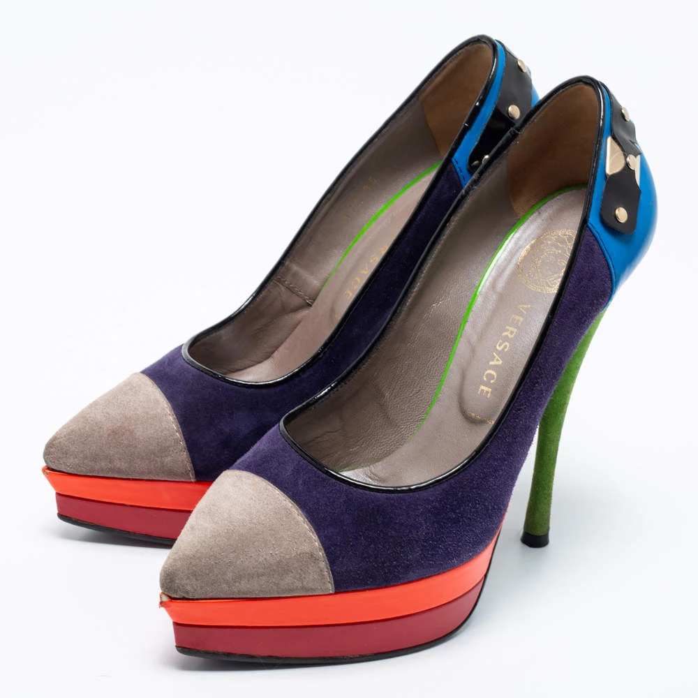 Crafted using multicolor suede and leather, these Versace pumps are meant to add a sophisticated finish to your look of the day. The designer pumps feature pointed toes, low platforms, and 14 cm heels.