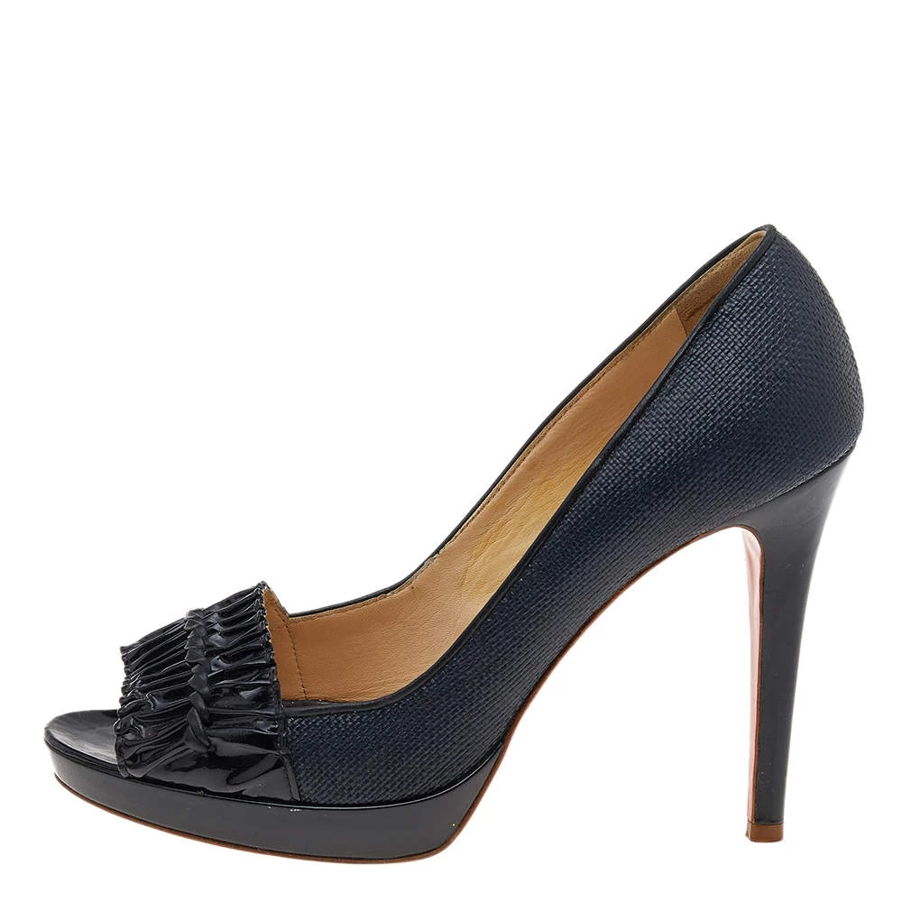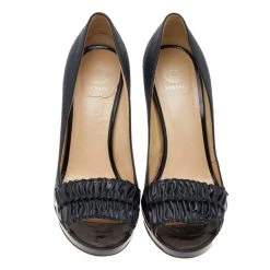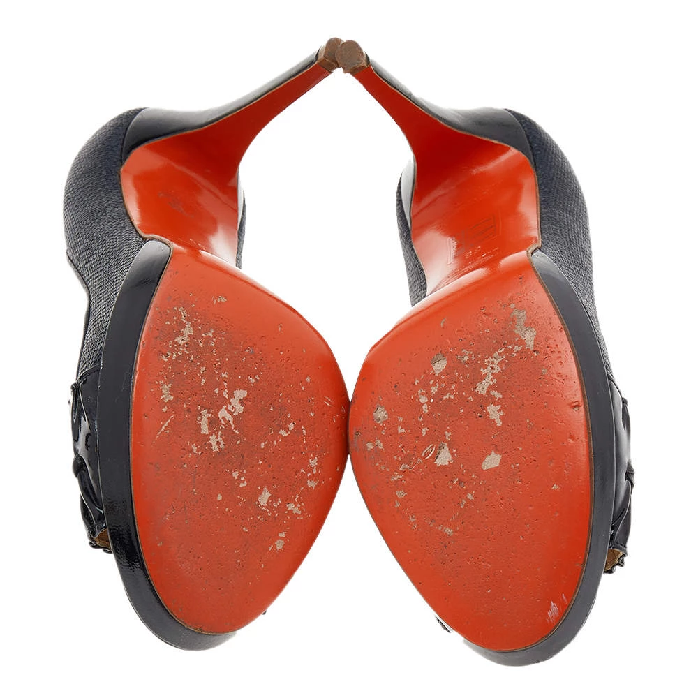 Add a stylish edge to your feet by wearing these pumps from Versace. They are designed using navy-blue/black raffia and patent leather on the exterior and showcase peep-toes, pointy heels, and a stunning shape.
